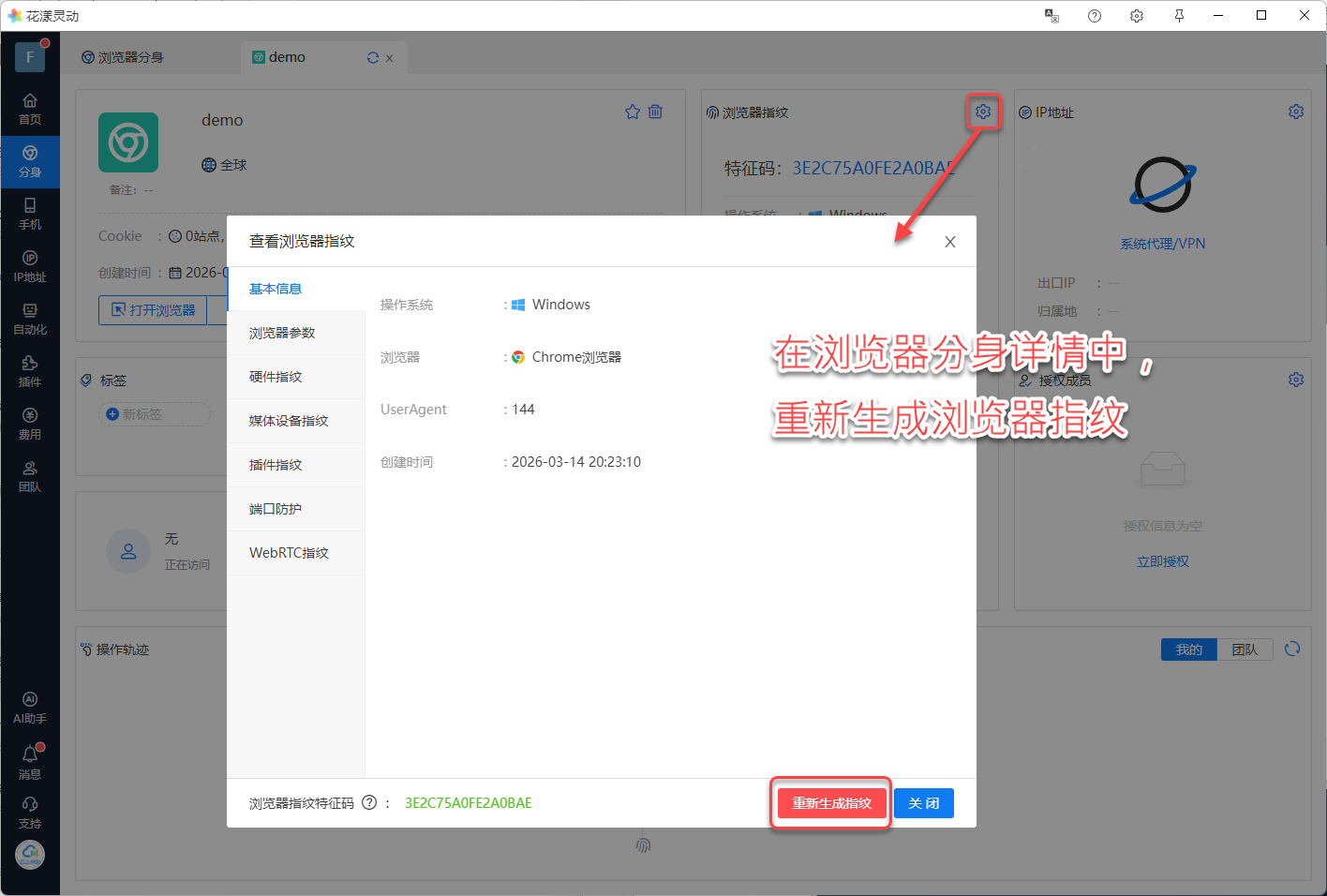 请进入浏览器分身详情页面,重新生成浏览器指纹: