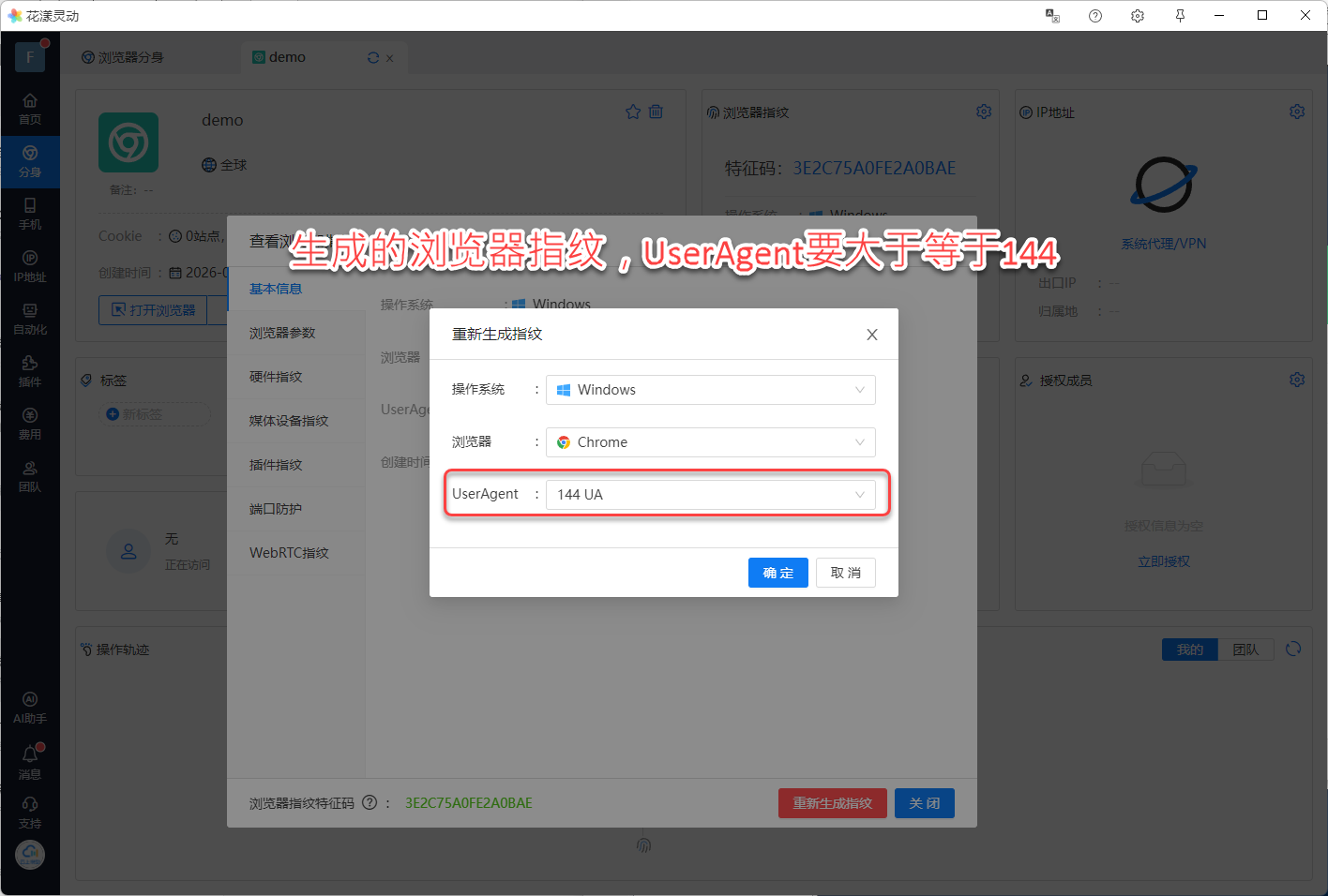 请重新生成浏览器指纹,请注意,此处的 UserAgent 请选择最高版本,如大于等于 144 :