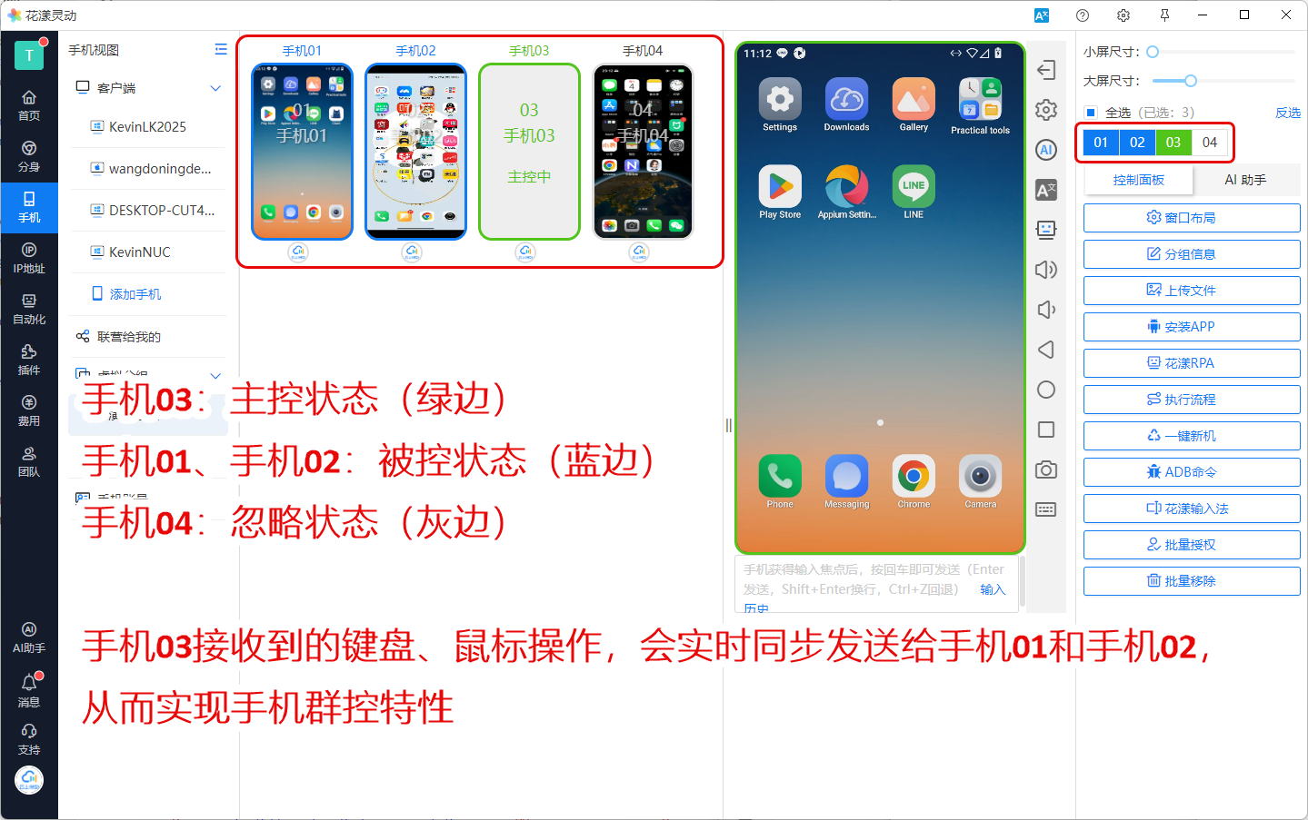 通过对小屏状态中的手机进行双击,我们可以将该手机置为“主控”状态(此时手机边框为绿色),同时,我们可以选中若干部小屏状态的手机(选中后的手机边框为蓝色),选中的手机称之为“被控”状态;此时,当我们对“主控”手机做各种操作时,键盘、鼠标产生的各种动作会实时同步发送给“被控”状态的手机,从而实现手机群控的特性。