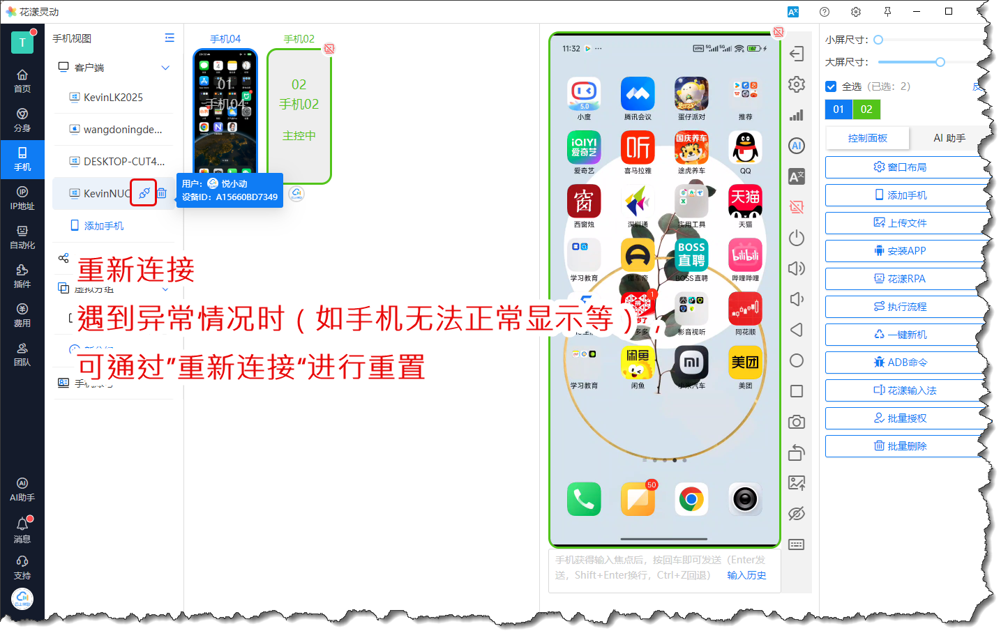 重新连接 :某些极端情况下,手机可能出现不响应或者黑屏的情况,这大概率是因为 ADB 协议导致的连接错误,此时可以点击 “重新连接”,相当于手机拔下 USB 线缆重新插入,但需要提醒您的是,此操作会影响到该花漾客户端所连接的所有手机,请谨慎操作。