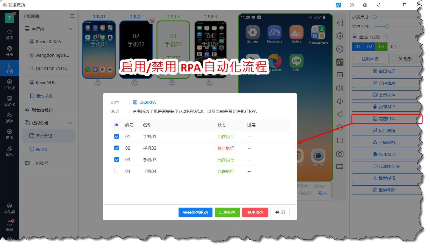 允许/禁止RPA流程执行 :点击此按钮会在允许/禁止执行RPA流程两种状态之间进行切换,它的使用场景是:我们需要在控制手机时不希望该手机同时执行 RPA 流程而产生打架行为,此时可以先进入到“禁止执行RPA流程的状态”再操作手机;在此状态下,如果有新的 RPA 流程调度到该手机执行时,RPA 流程会处于排队等待或取消执行等状态。