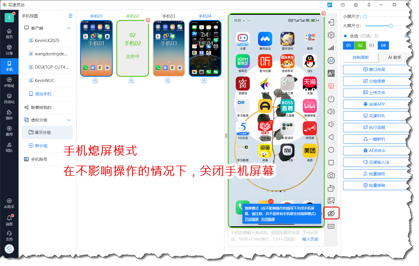 通过上文的阅读,我们了解了在花漾客户端中管理一部手机的基本操作,本文向您介绍如何同时管理多部手机,实现手机群控特性。