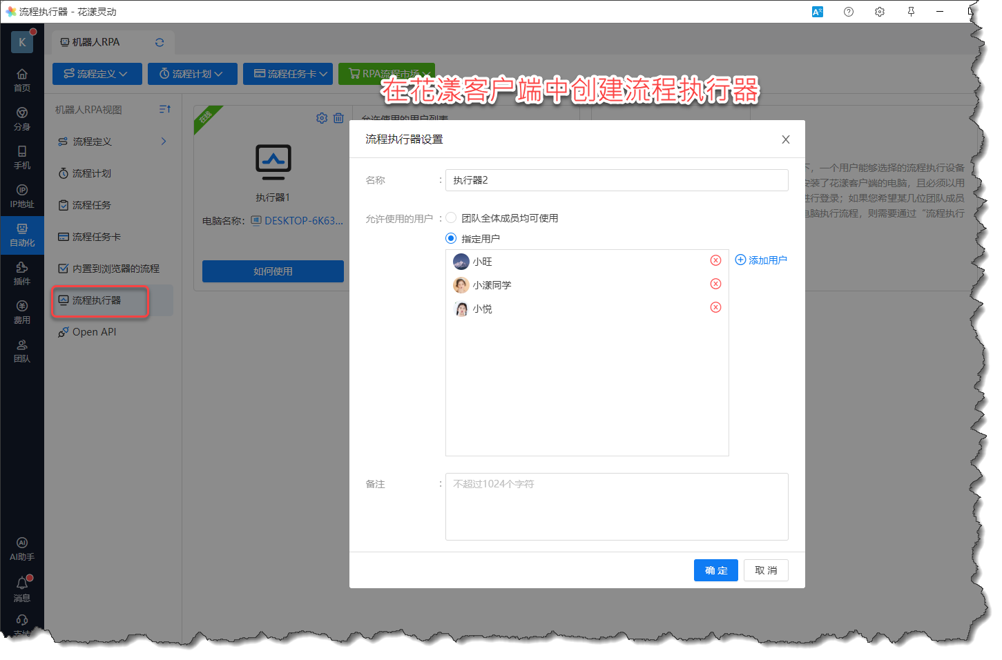 首先,您需要在花漾客户端中创建一个“流程执行器”(创建者需要拥有“流程任务卡与流程执行器的管理权”),在创建向导中,我们需要为执行器起一个名称,并指定给哪些用户所使用:
