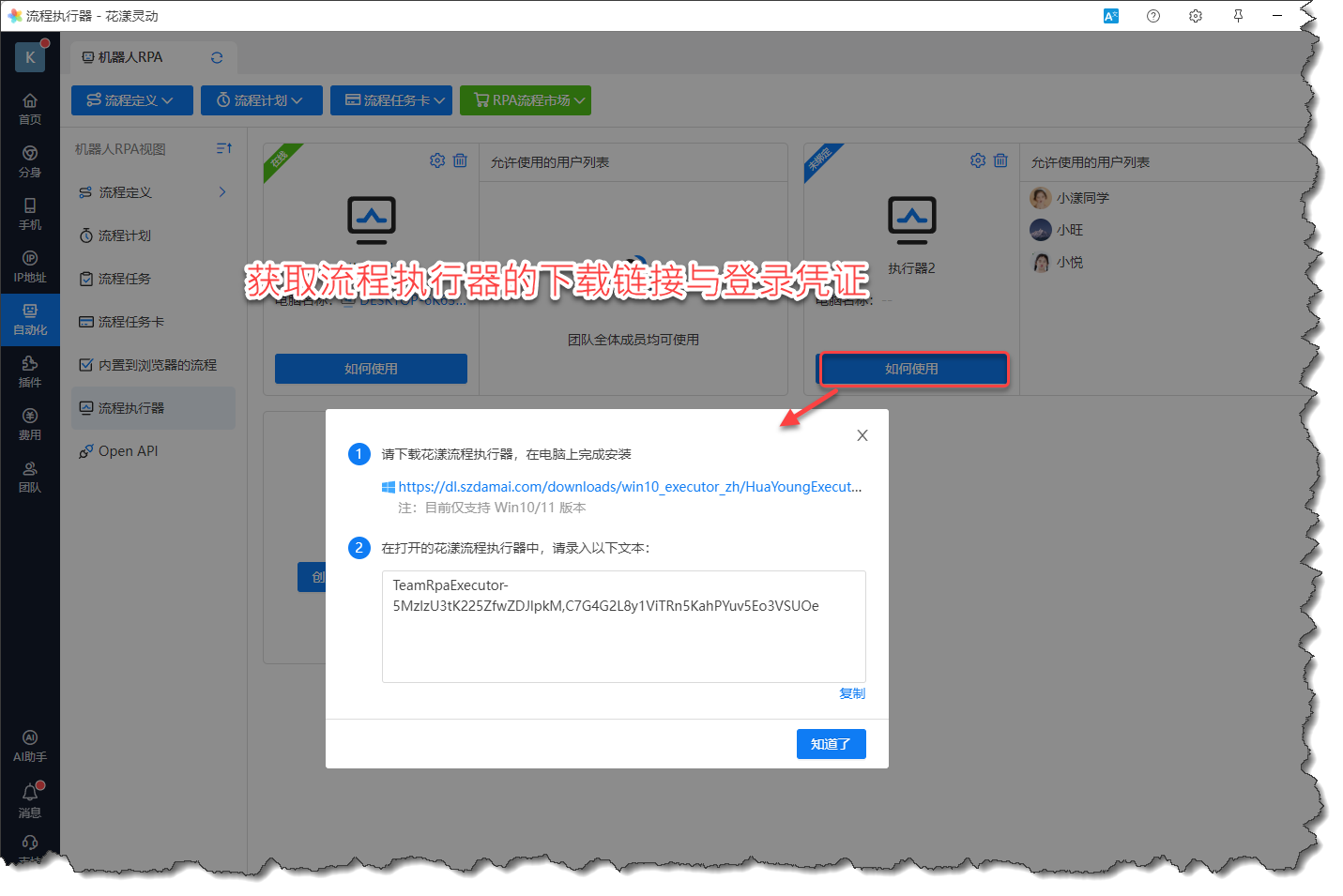 流程执行器创建完毕后,点击“如何使用”,获取其下载链接与登录凭证: