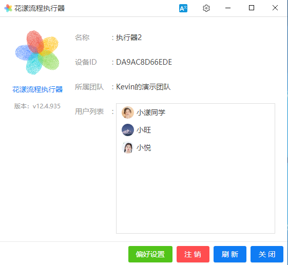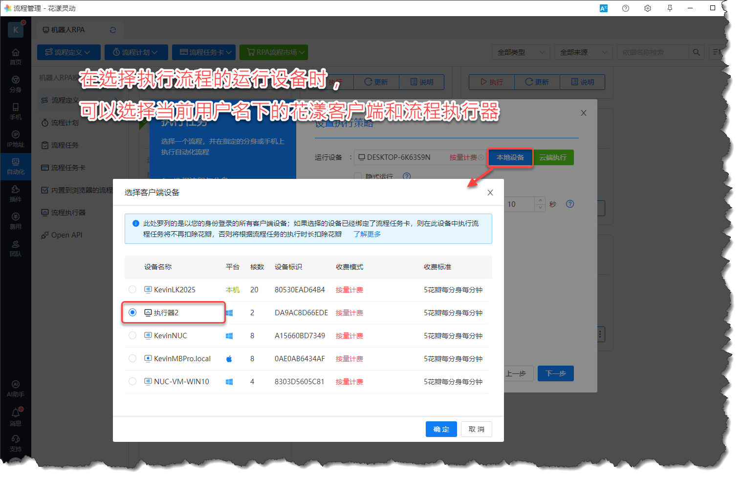 当用户在执行流程时,除了可以选择其名下的花漾客户端,也可以选择其名下的流程执行器,如下图所示: