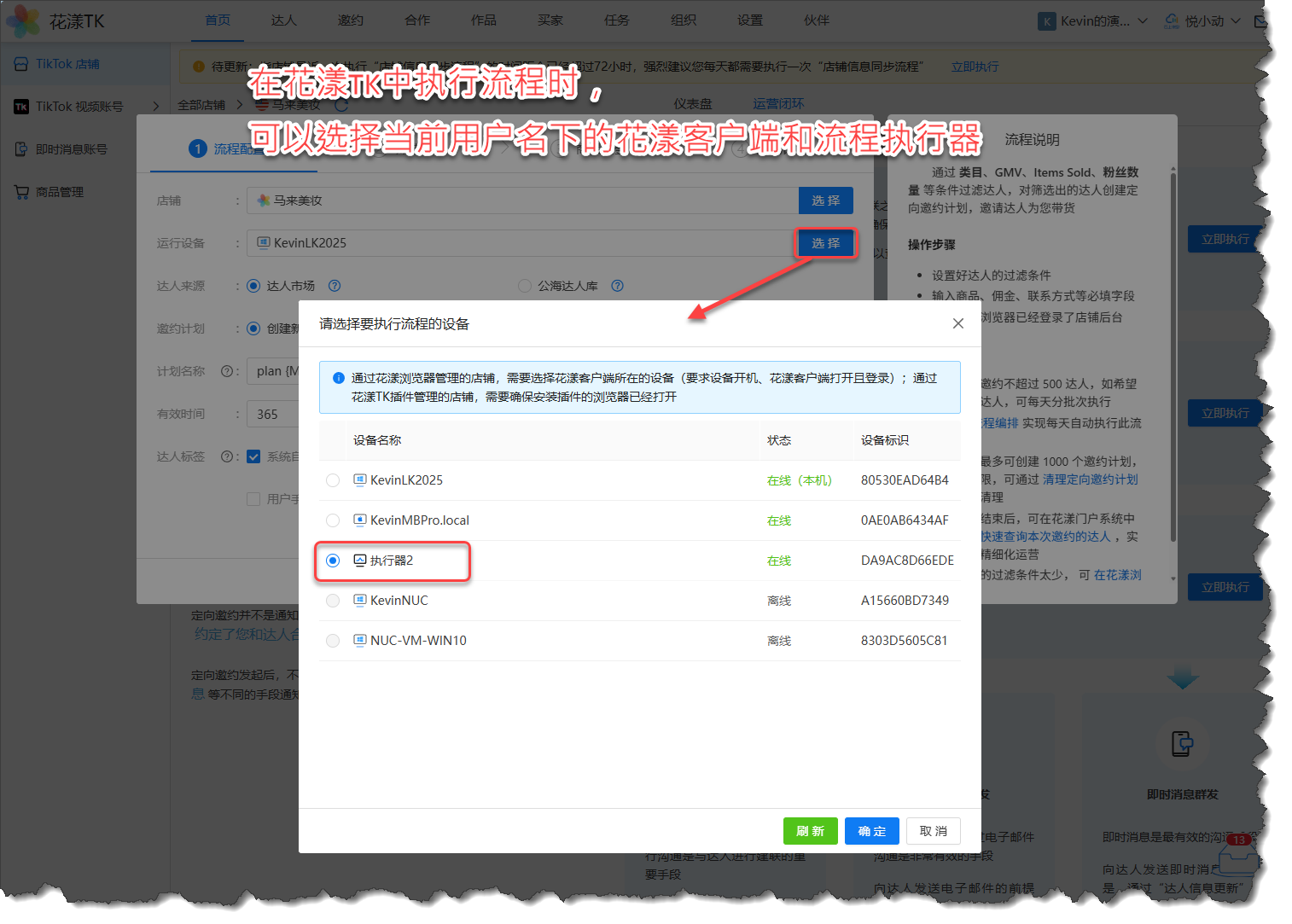 我们以“花漾TK”为例,在花漾TK门户 tkshop.szdamai.com 中执行邀约流程时,既可以选择用户名下的花漾客户端,也可以选择流程执行器: