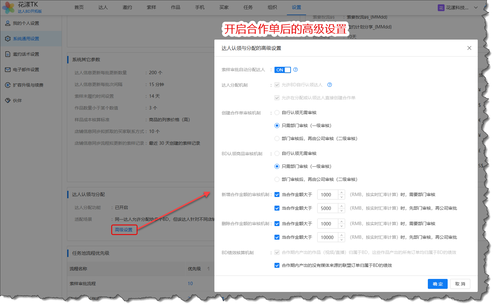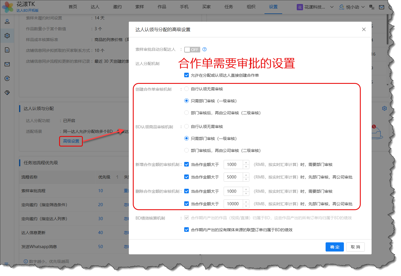 很多公司会将达人分配给商务拓展人员(以下简称 BD),由 BD 负责该达人的商务合作对接,您可以决定是否要在花漾TK系统中开启此特性,前提是您购买的是 “BD开拓版” 套餐版本。