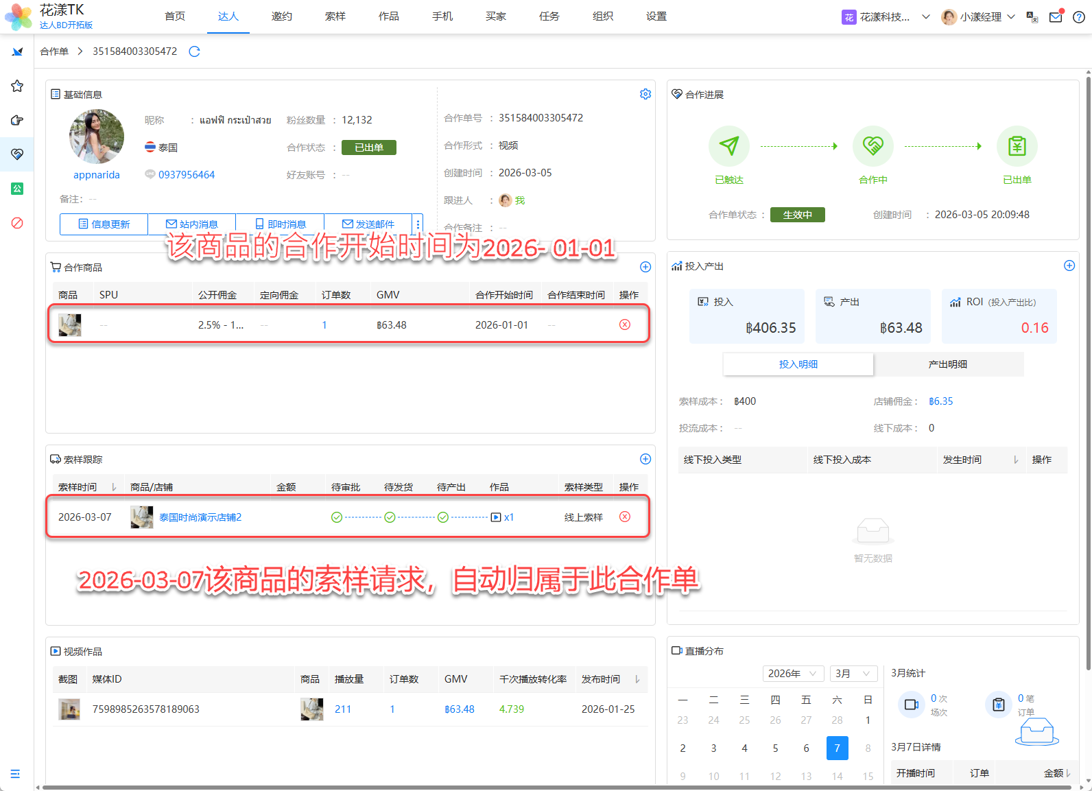 我们以下图为例,在该合作单中,引入了一个合作商品,其合作开始时间自 2026-01-01,在 03-07 该达人针对该商品申请了一个样品,那么,该索样记录会被自动归属到该合作单中。