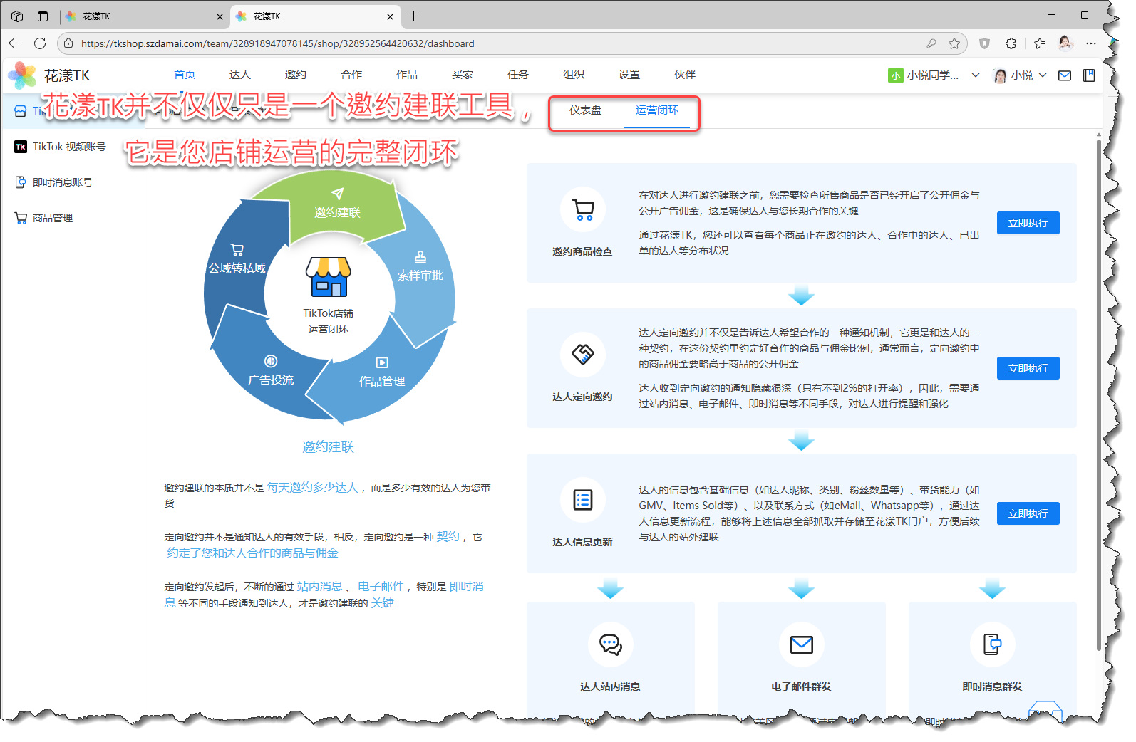 大部分同学迫切想做的事情是:与达人进行邀约建联。需要提醒您的是,达人的邀约建联只是花漾TK不足10%的功能,与其它邀约工具相比,花漾TK提供给您的是从“邀约建联”、“索样审批”、“作品管理”、“广告投流”、到“公域转私域”的运营闭环: