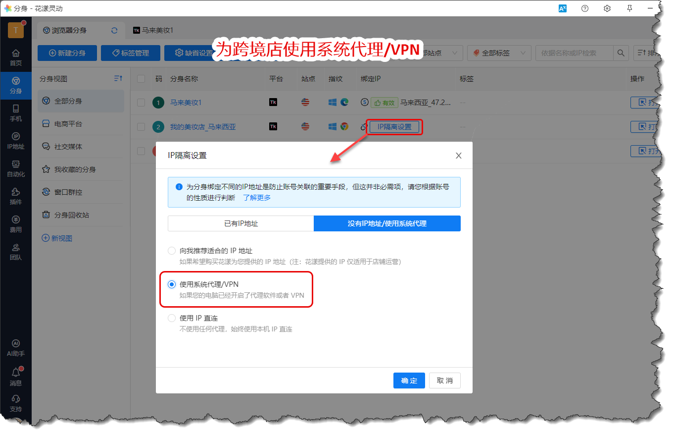 如果您所在电脑开着梯子,并通过梯子访问店铺后台,可以设置店铺的IP隔离为 “使用系统代理/VPN” (以下操作均在花漾客户端中完成),如下图所示: