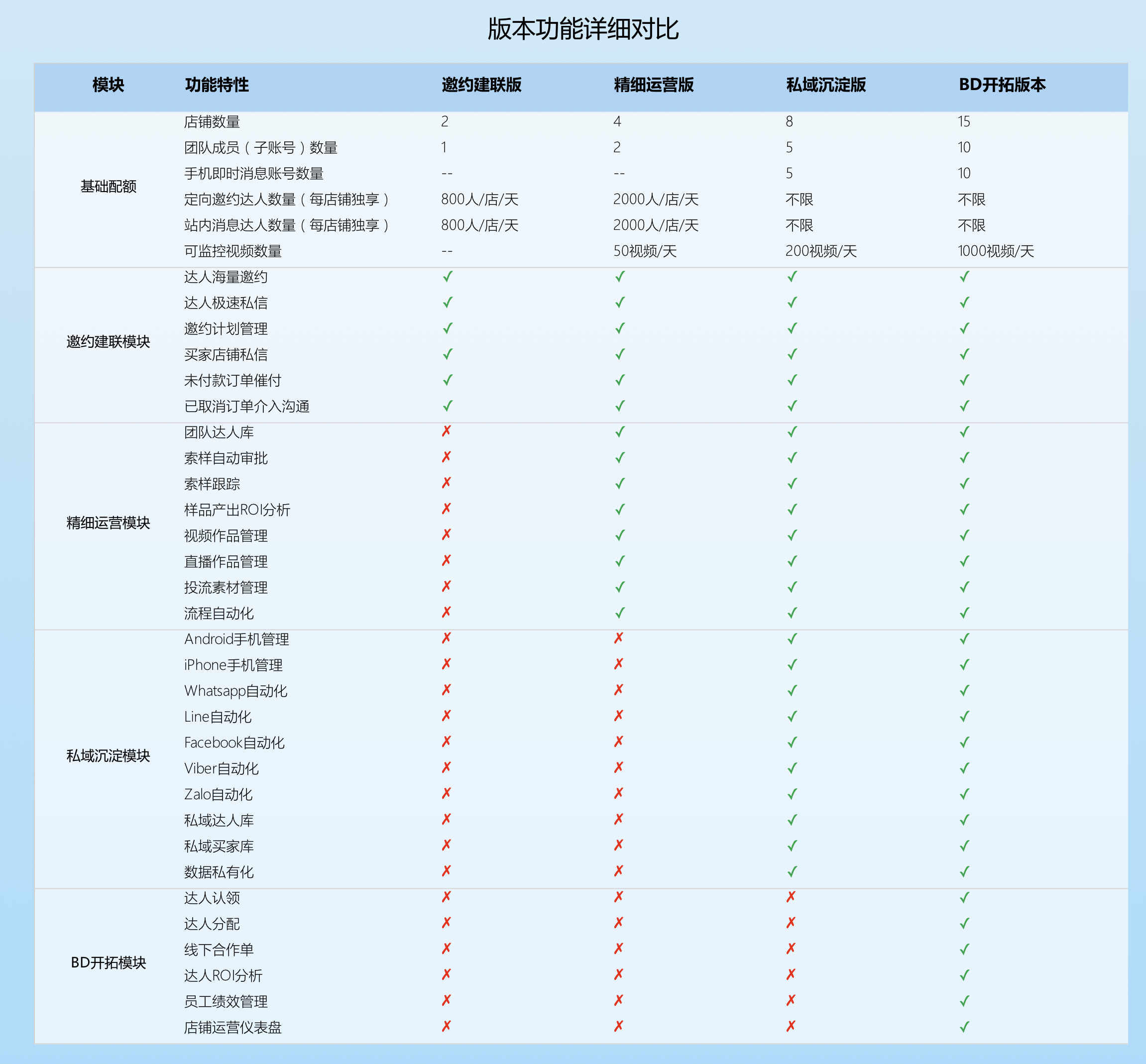 花漾TK系统分为 “邀约建联版” 、 “精细运营版” 、 “私域沉淀版” 、 “BD开拓版” 4个版本的套餐规格,它们的差异如下图所示: