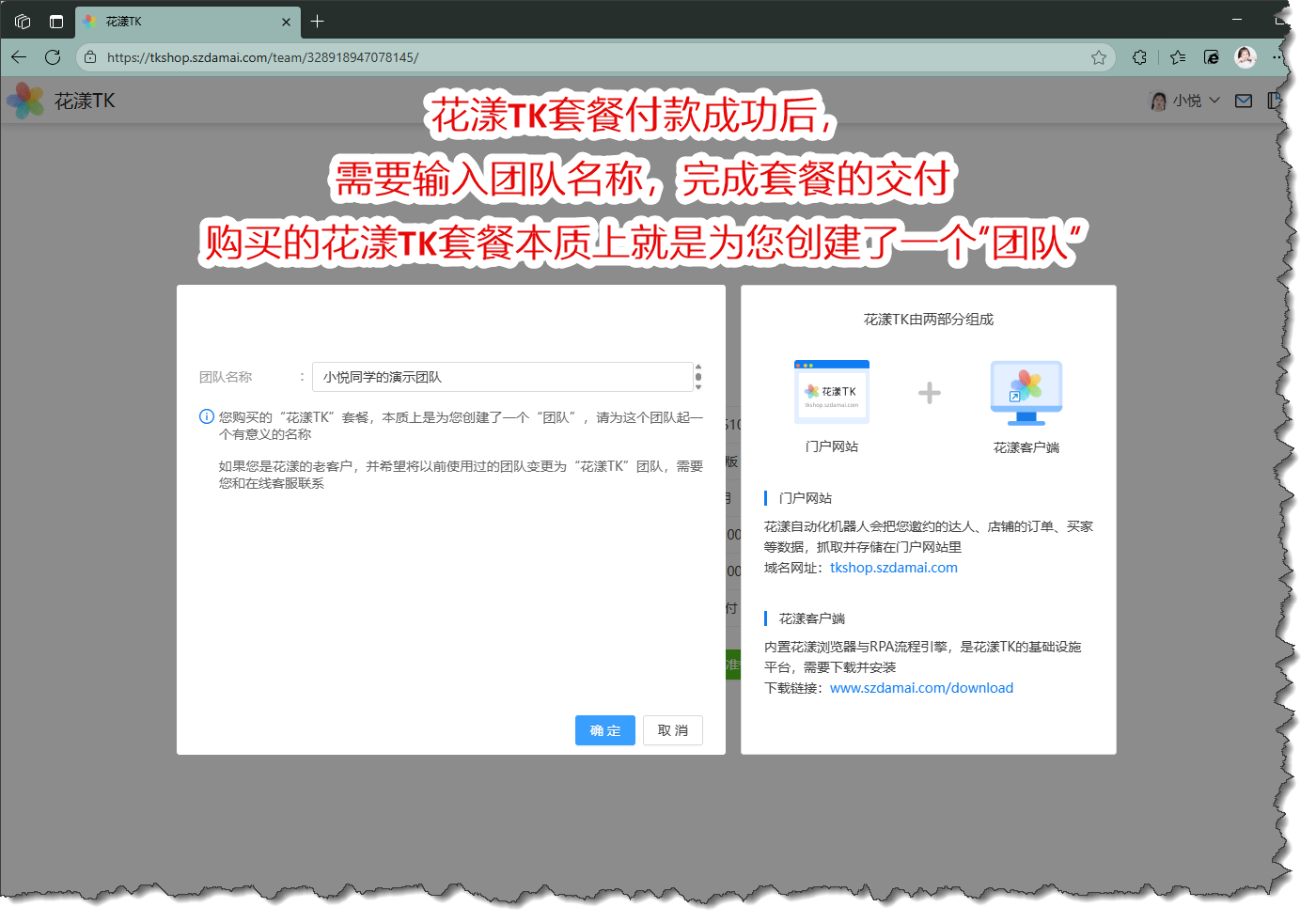 当您完成支付后,花漾TK门户网站 将进入到交付界面,请输入一个有意义的团队名称,点击“确定”即可完成交付: