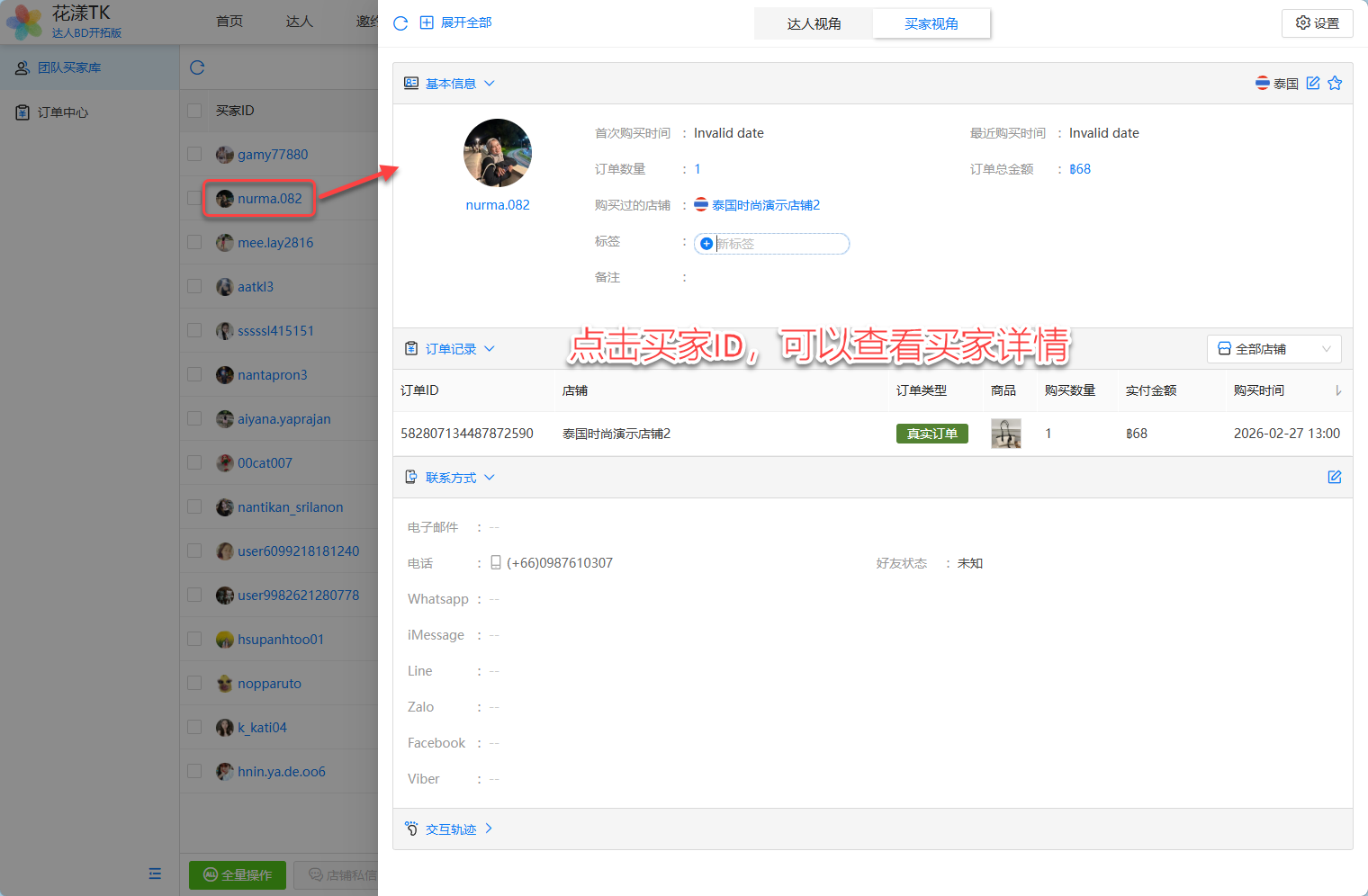在团队买家库中,我们可以看到买家的联系方式: