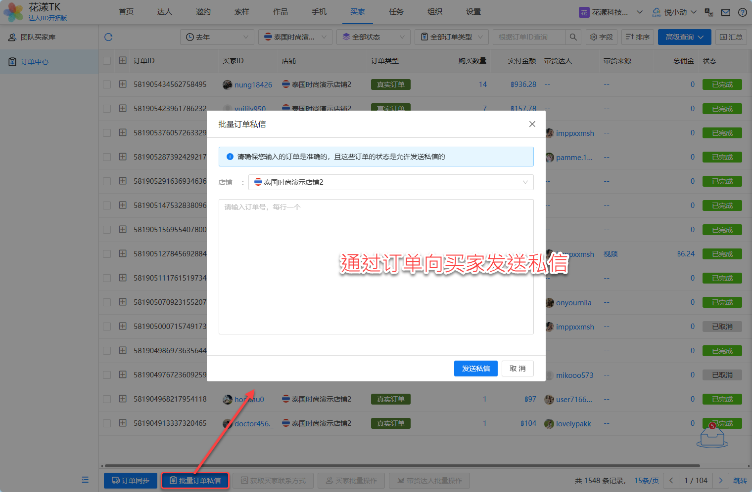 您也可以在“订单中心”中,选择多笔订单(或者手动录入多笔订单号),批量向订单的买家发送店铺私信:
