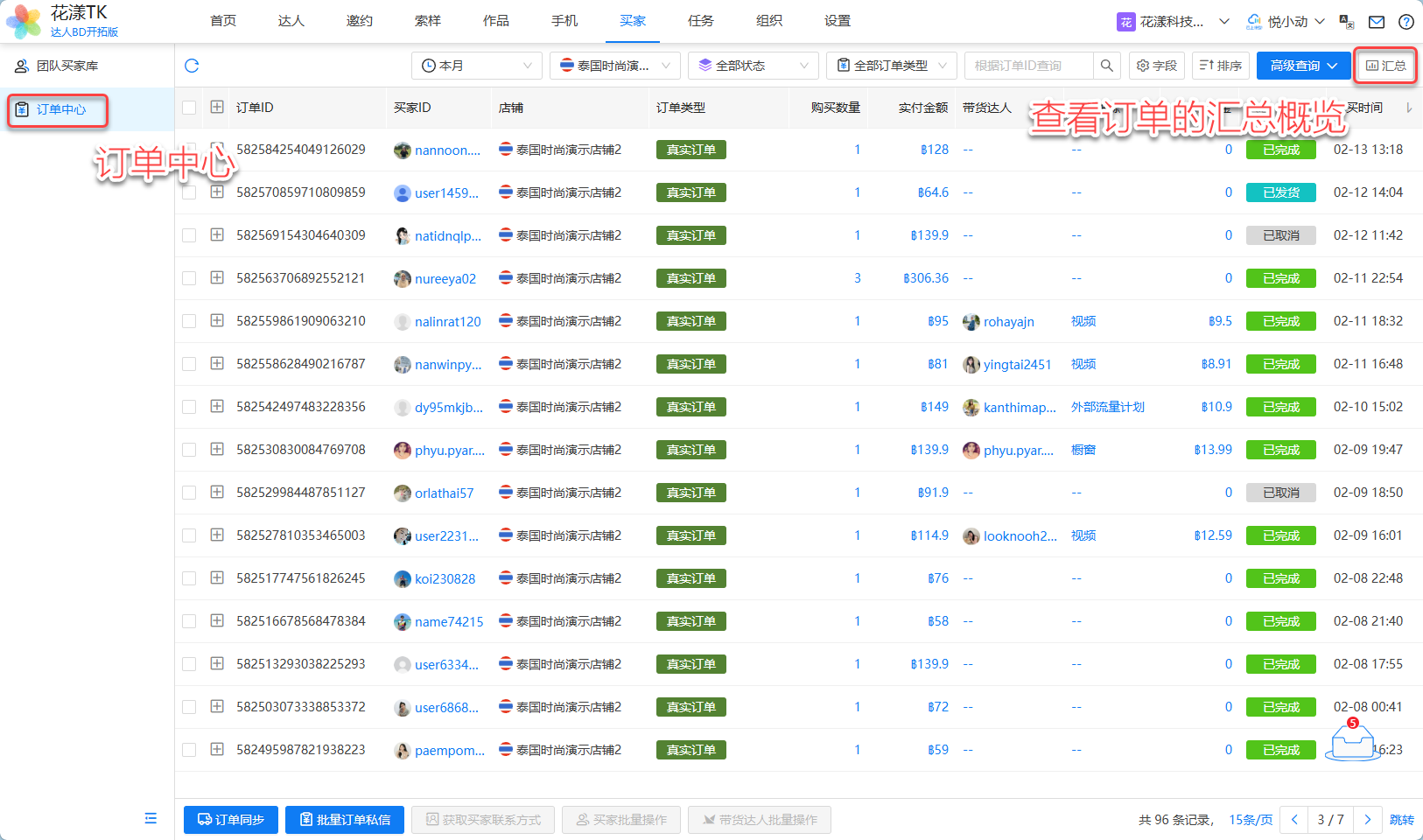 我们知道,无论达人还是买家,本质上都是一个 TikTok 用户,只不过从“达人”或者“买家”不同的视角来观察而已。在花漾TK中,我们可以随时切换“达人”或者“买家”的视角。举例,一笔索样订单,其“买家”就是“索样达人”,如下图所示: