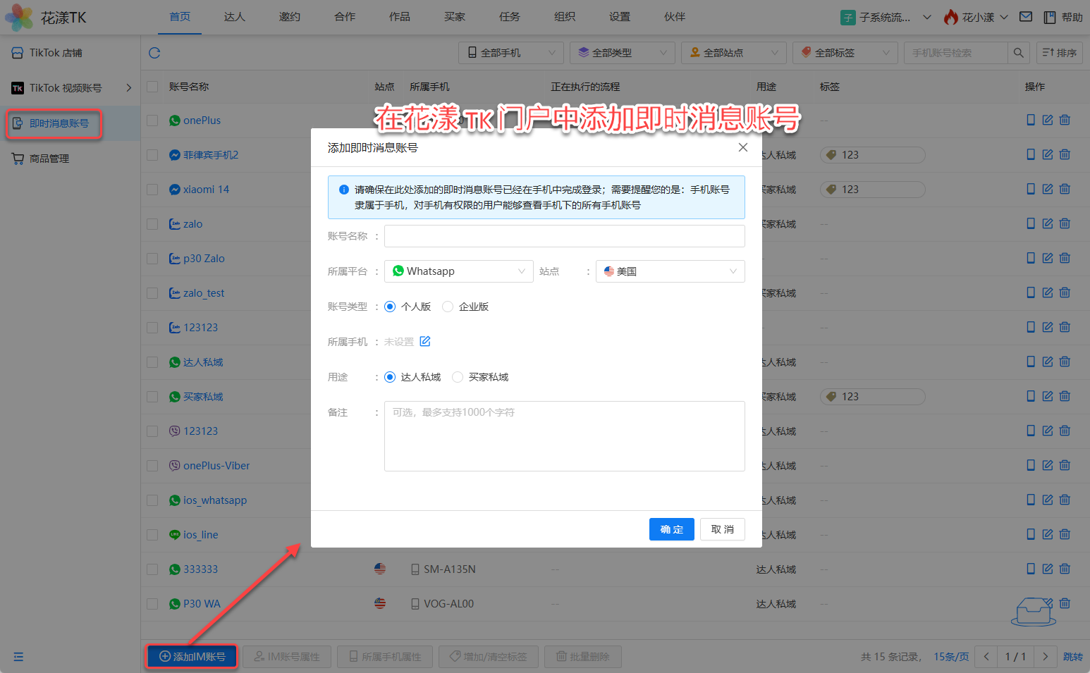 - 再次强调的是:这里添加的即时消息账号是指您已经在手机中完成了账号的登录,只是在这里告诉花漾TK系统有这么一个指定即时消息类型的手机账号而已