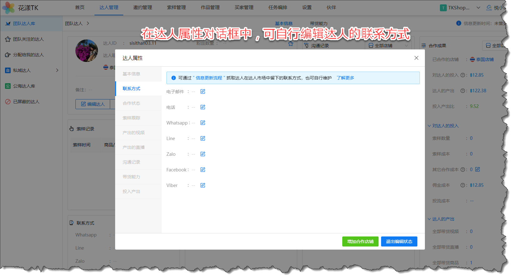 当然,如果您针对某一达人已经拥有其联系方式,也可在达人的属性对话框中,自行编辑其联系方式: