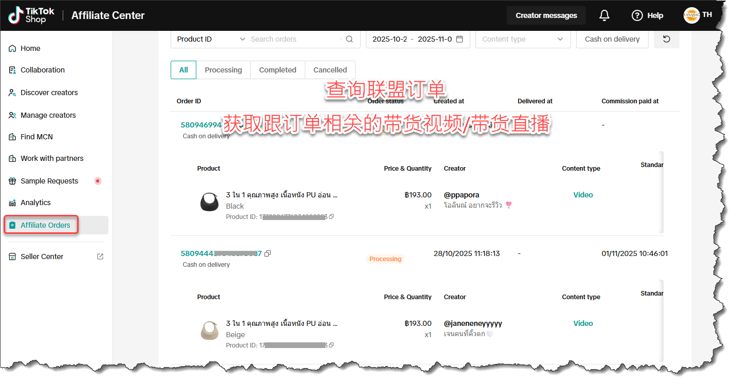 查询店铺后台的联盟订单,获取跟订单相关的带货视频与直播及相关产出