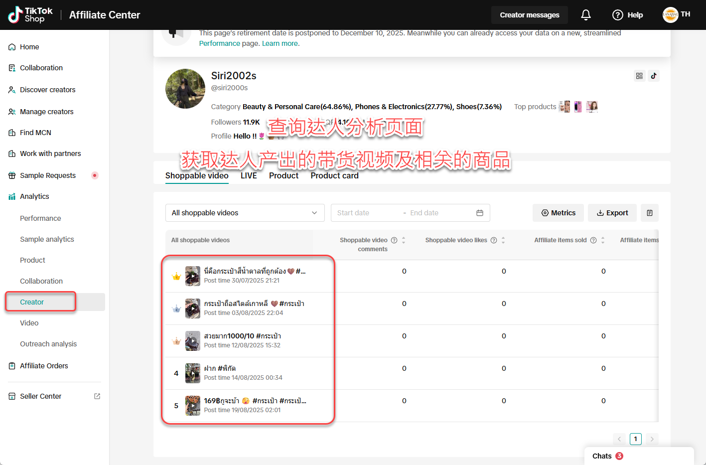 查询店铺后台的达人分析页面,此处会列出达人产出的带货视频与直播及相关产出