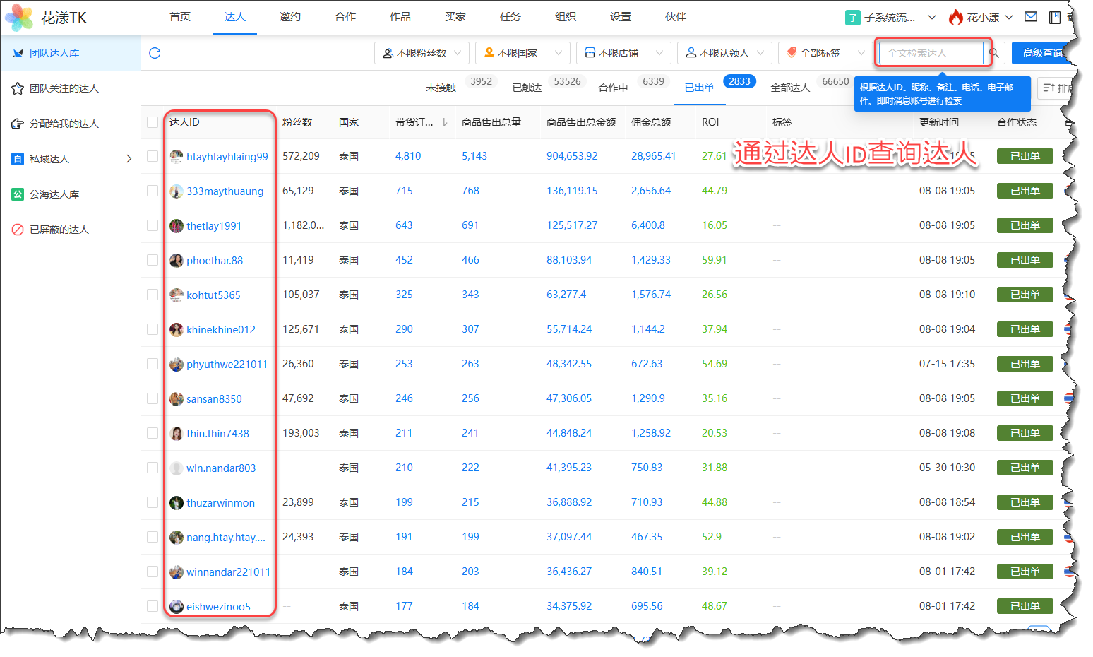 达人ID最主要的用途是用来 “查询并定位” 达人,在花漾TK门户中,大量的场景都是通过达人ID来搜索达人的: