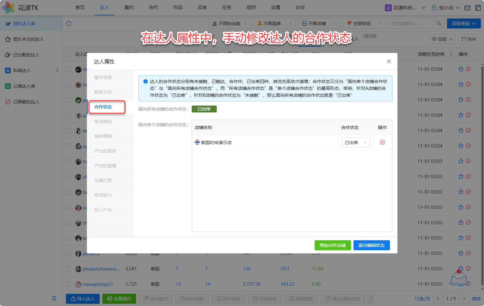 在达人属性对话框中,您可以自行修改达人的合作状态: