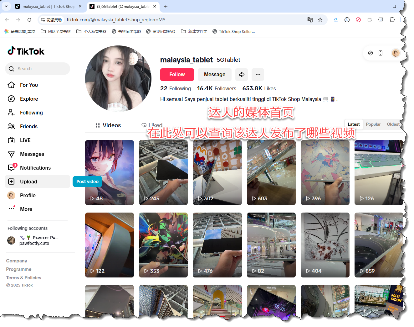 媒体首页,暨达人在 tiktok.com 中的首页,在此处可以查看达人发布了哪些作品,达人的粉丝数等信息: