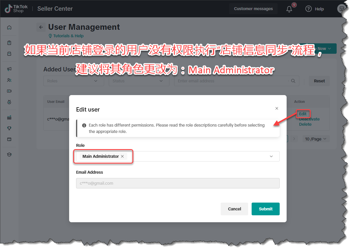 答:如果当前店铺后台登录的子账号没有权限执行“店铺信息同步”流程,如:无法抓取订单等,您需要到店铺后台为该用户进行授权,最简单的做法是,更改此用户的角色为“Main Administrator”: