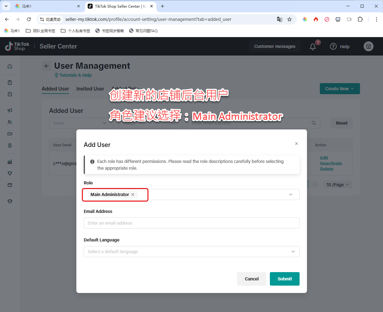 录入用户的相关信息,其中,角色建议选择 Main Administrator,然后输入 Email Address 等信息,点击:Submit