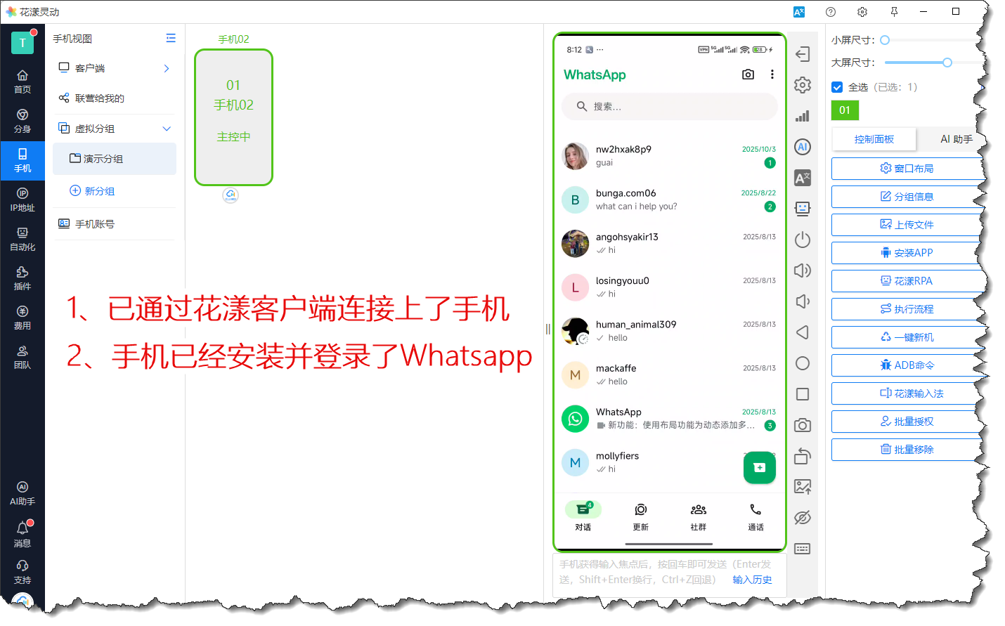 点击“确定”后,系统会创建一笔流程任务放到任务池中,稍待片刻,可以看到手机开始执行“手机即时消息_添加好友”的流程,自动将上述达人的 Whatsapp 账号添加为好友: