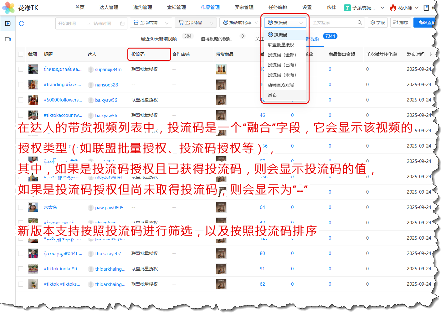 本版本支持通过“投流码”对达人的带货视频进行筛选: