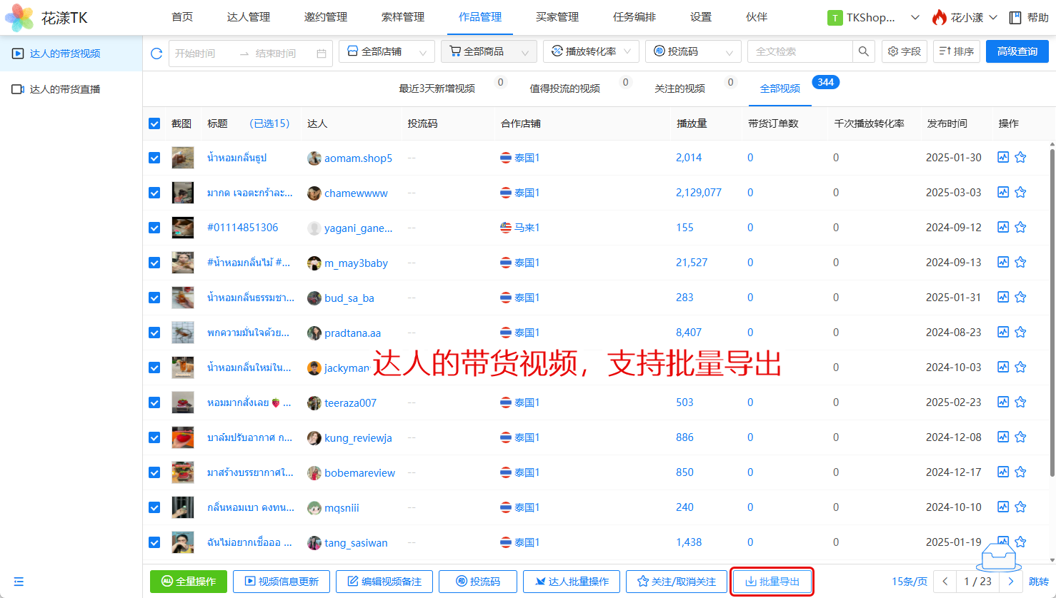 本版本支持对选中的达人带货视频导出为 Excel 表格: