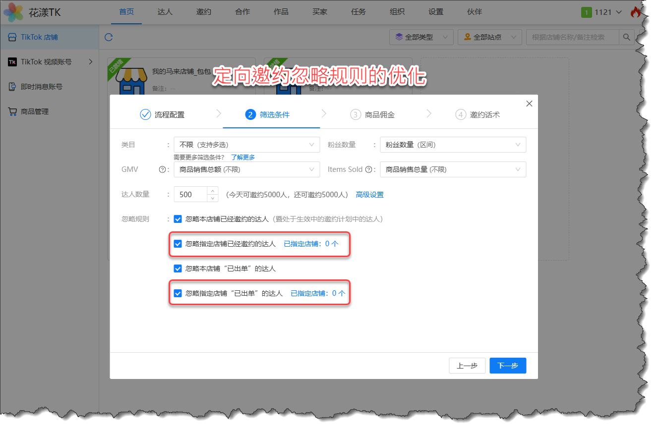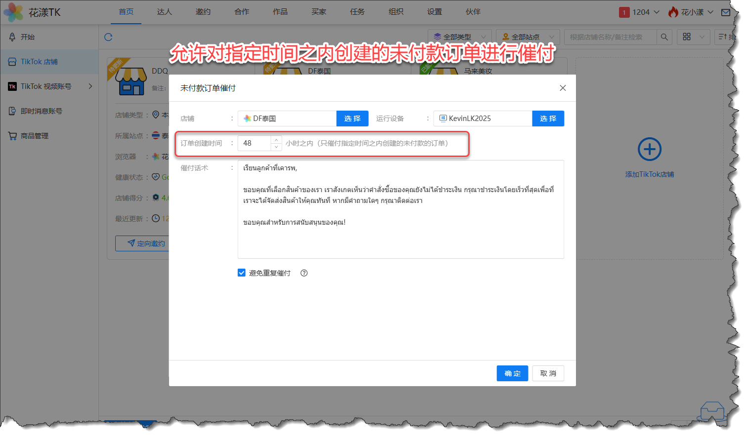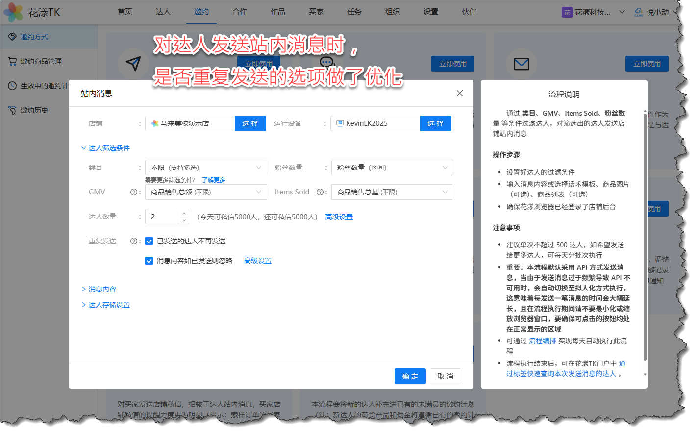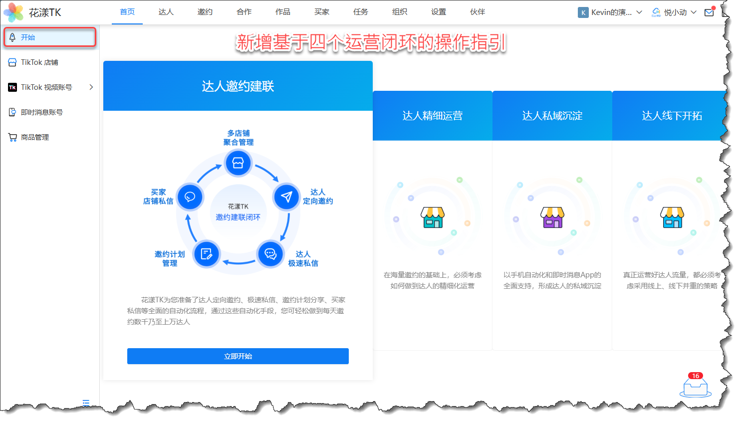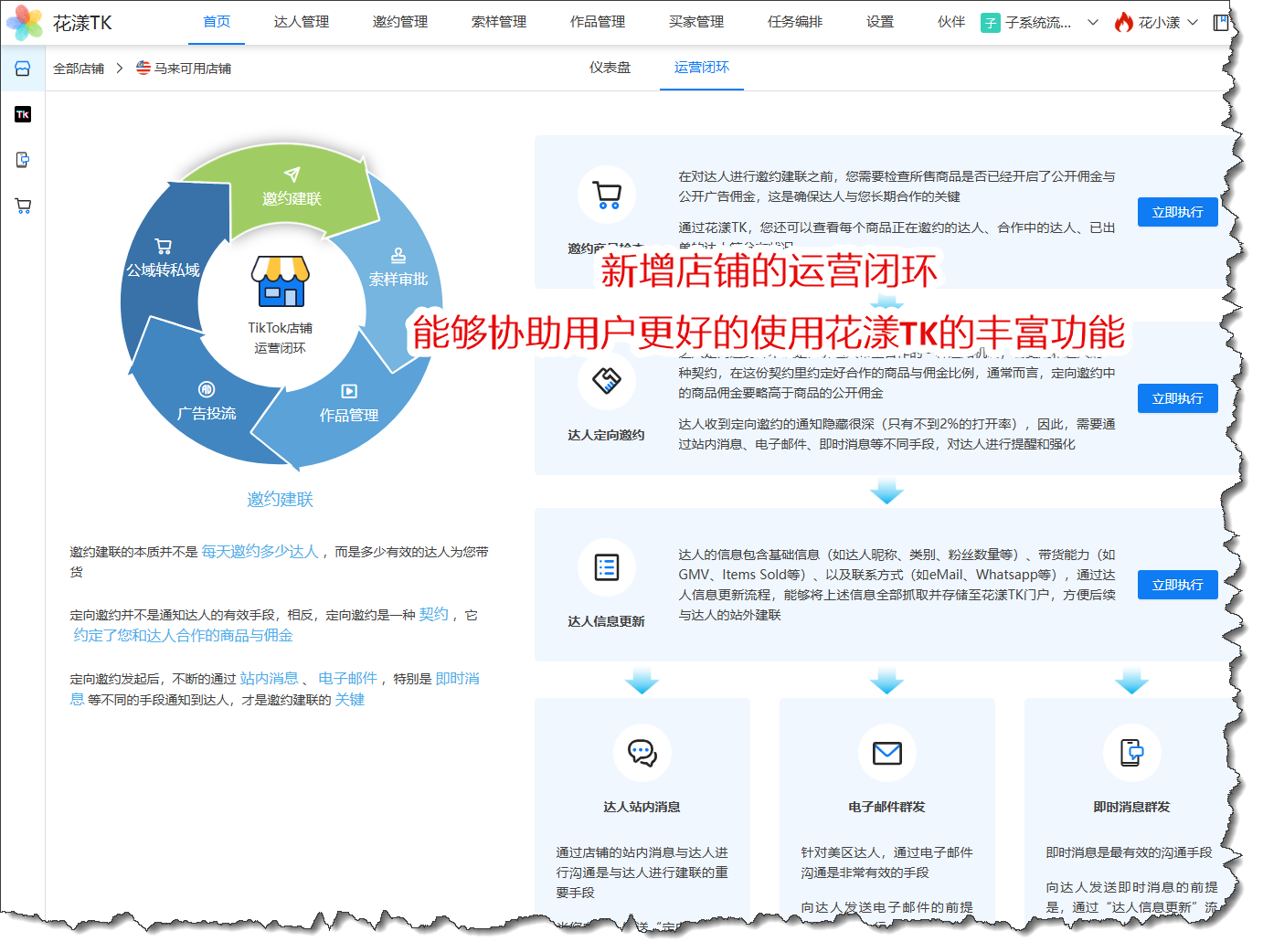 很多用户把花漾TK当成普通的“自动化邀约工具”,忽视了花漾TK大量丰富的功能;本版本上线了店铺的运营闭环特性,能够协助用户更好的使用花漾TK的其它功能: