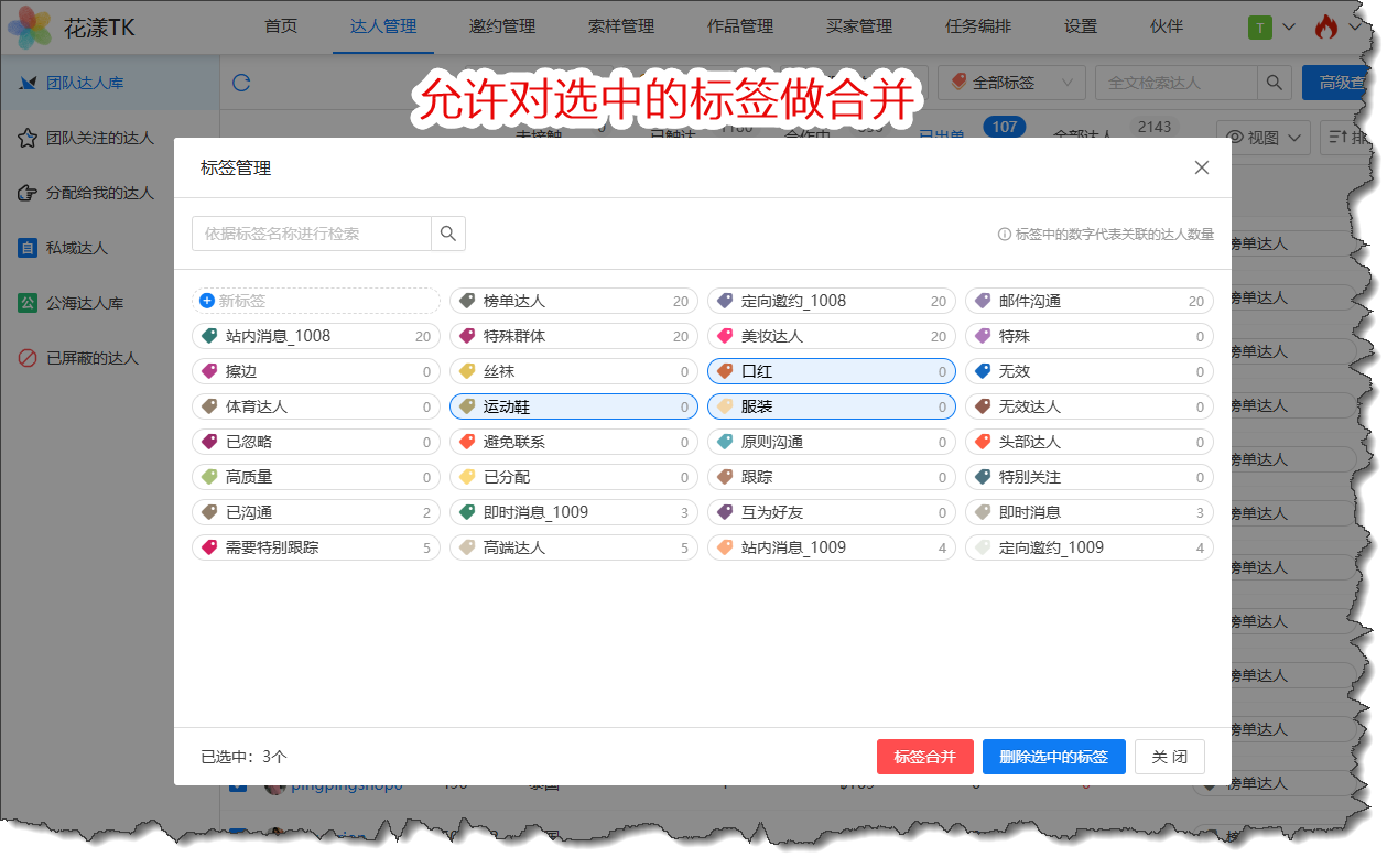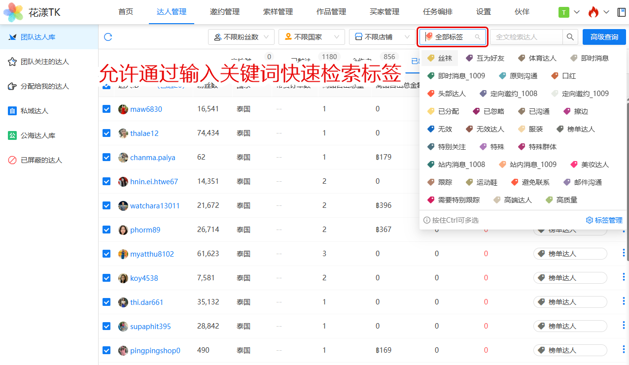 标签是花漾TK中非常重要的一个特性,但考虑到标签过多时使用不便,本版本对标签的管理做了强化。举例,在达人标签下拉列表中,会以更大的面积展示标签内容,同时,允许用户输入关键词快速检索标签: