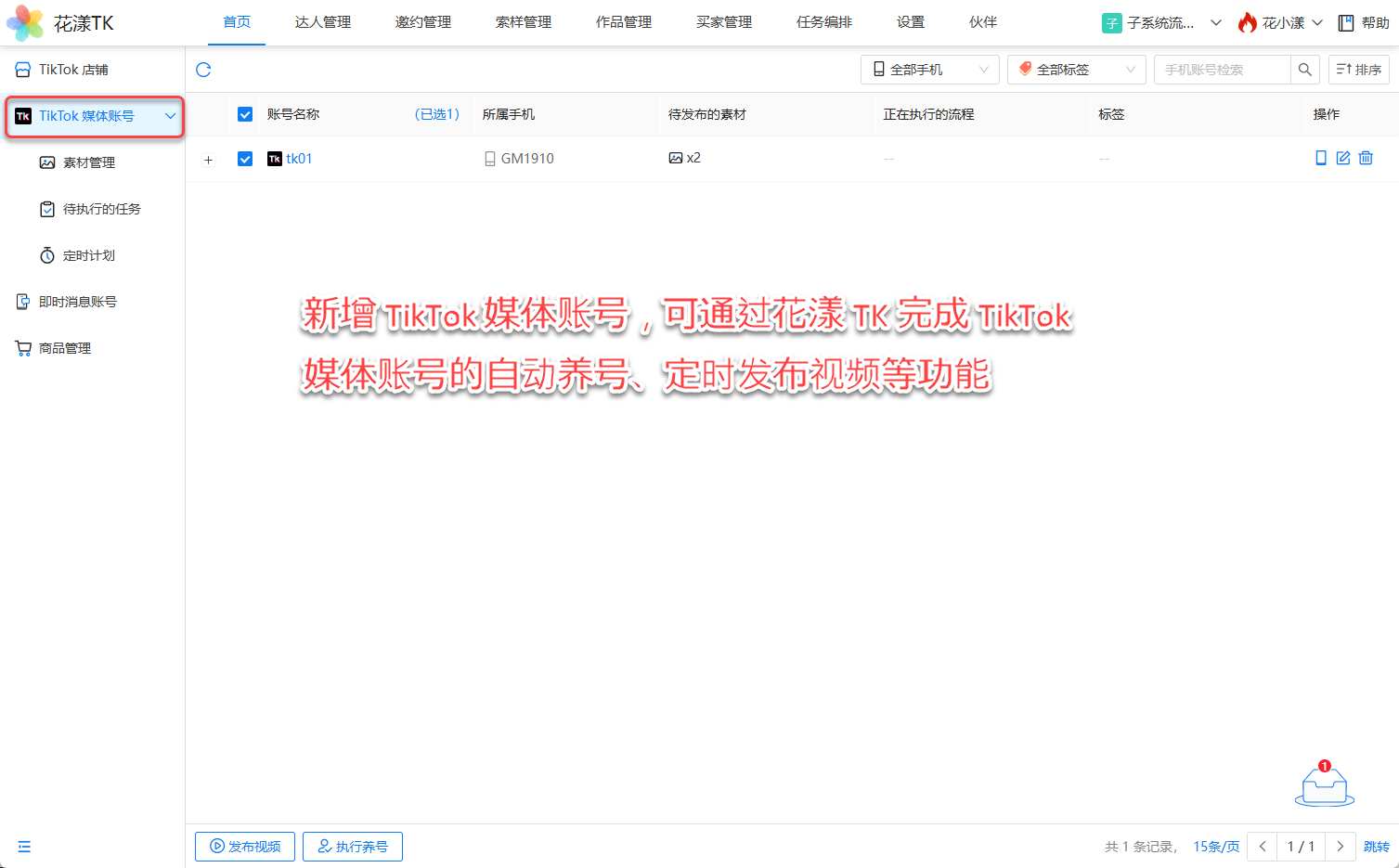 本版本新增 TikTok 媒体账号(暨短视频账号,以和店铺账号区分),可在花漾 TK 中完成自动养号、定时发布视频等功能,新版本支持 Android 手机与 iPhone,目前功能比较简单,供用户尝鲜使用。