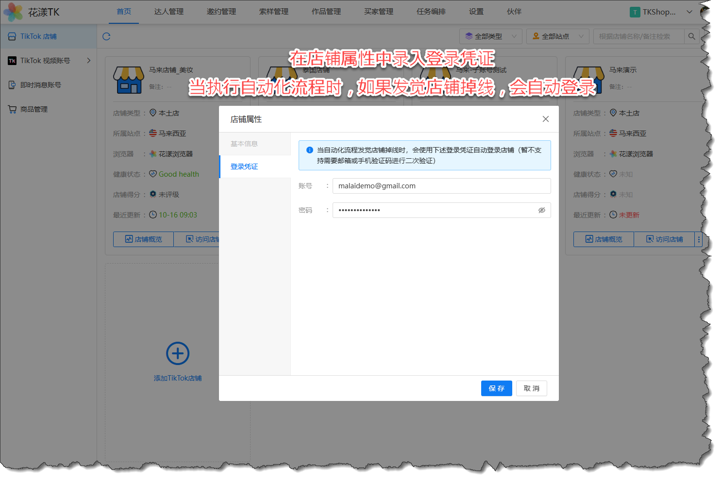 很多用户非常苦恼的是,店铺会经常性的掉线。本版本新增店铺掉线后的自动登录特性,您需要在店铺属性中录入店铺的登录凭证,当在执行自动化流程时,如果发觉店铺掉线,RPA流程会自动登录。
