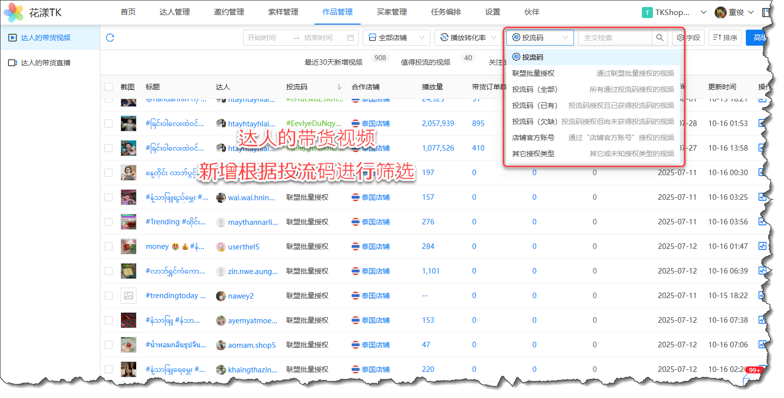 2、 达人带货视频新增根据投流码进行筛选