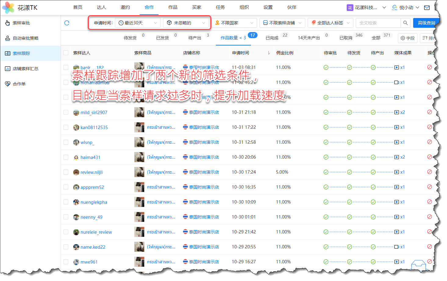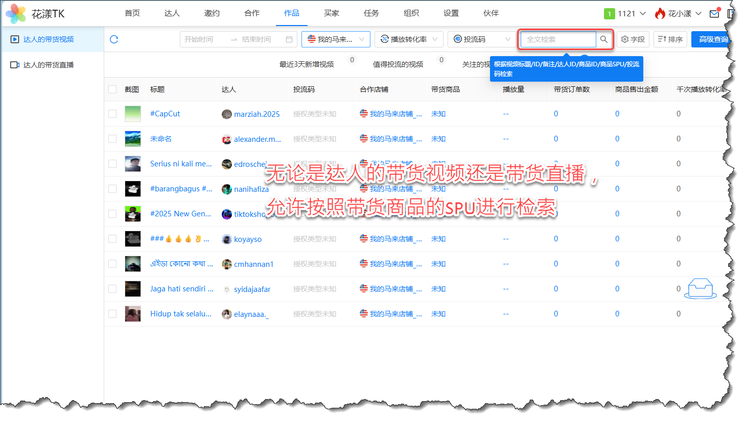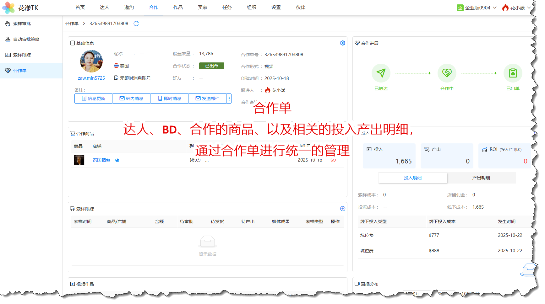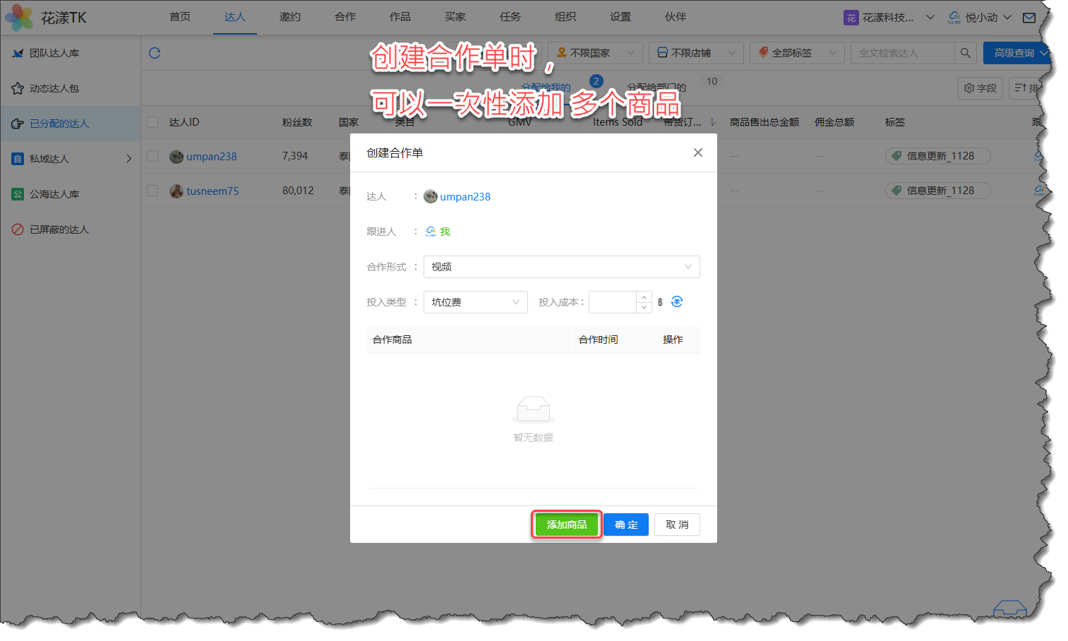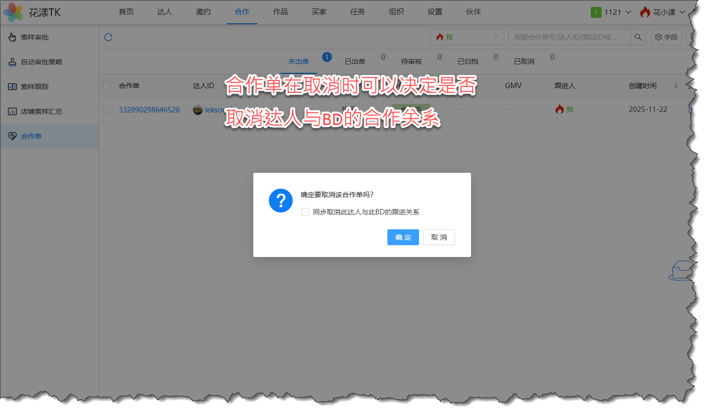新版本推出了一个新的概念:合作单,能够把达人、BD(商务拓展)、合作的商品、投入产出的明细,放到合作单里统一管理,这对上规模的卖家团队来说,能够更精细化的管理线下达人的建联与员工的绩效: