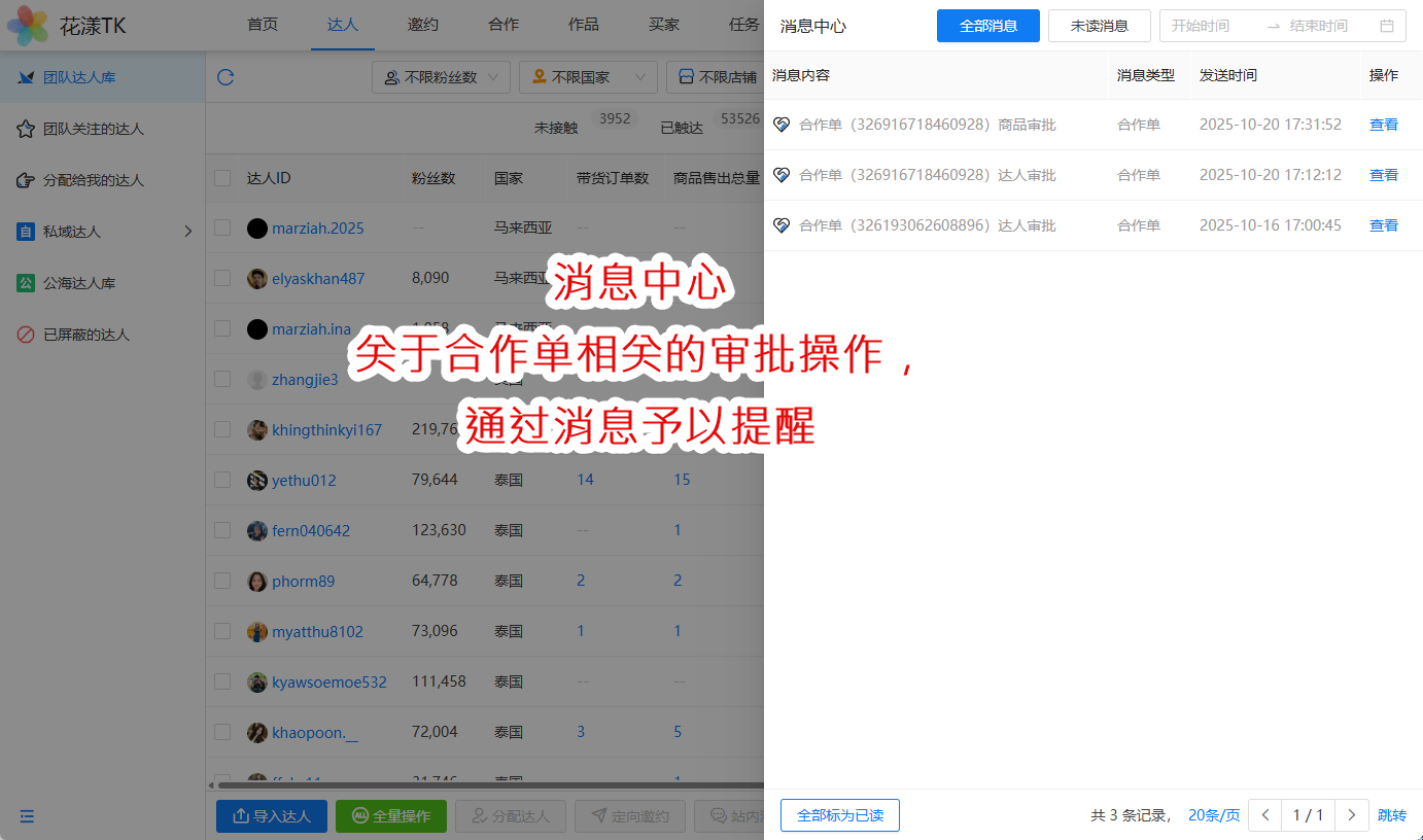 花漾TK门户增加了“消息中心”,主要使用场景是:一些关于合作单相关的审批操作,能够通过消息中心予以提醒:
