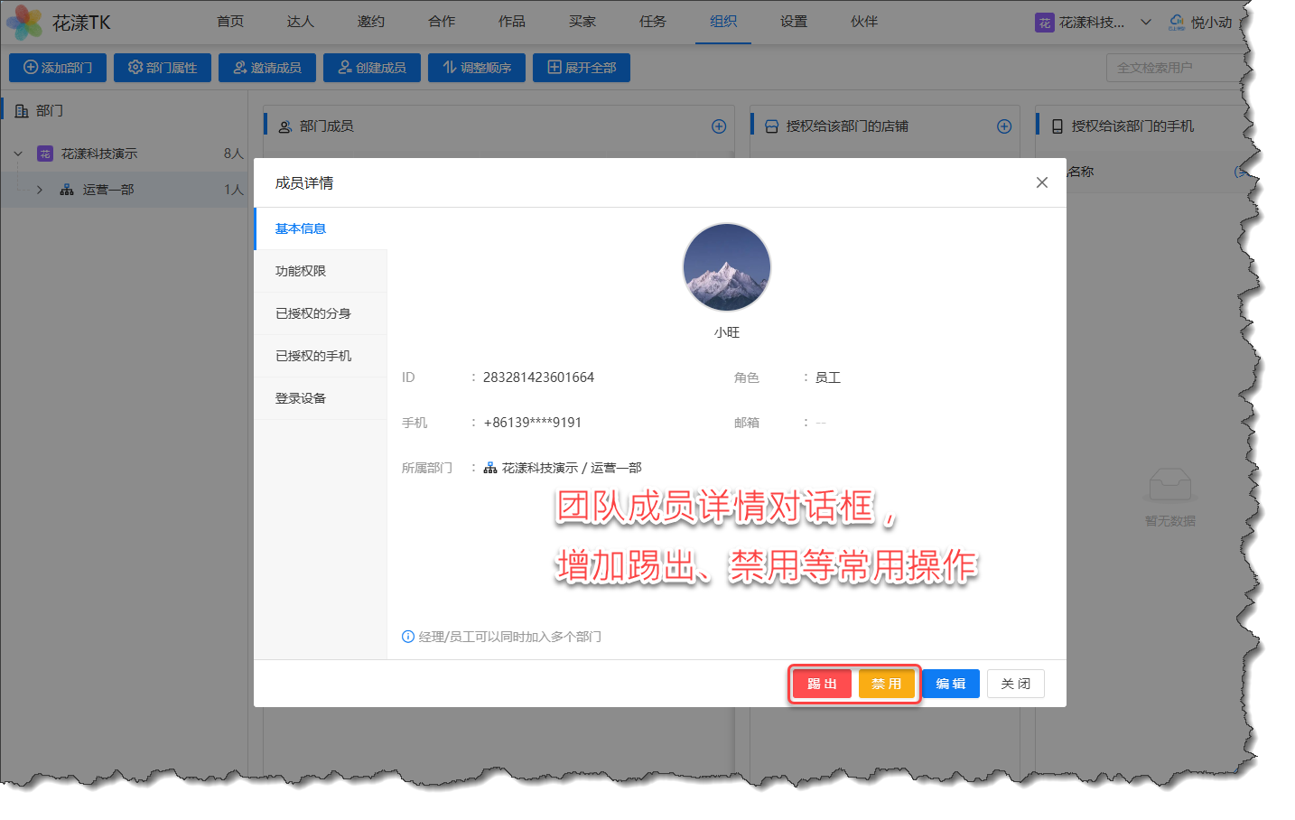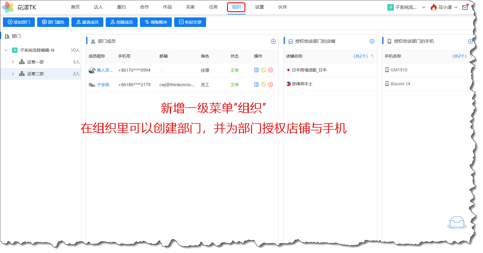 花漾TK门户新增一级菜单“组织”,通过“组织”页签,能够方便用户快速的的创建团队组织架构、部门成员,并将店铺或手机授权给部门,这意味着部门内的用户能够自动拥有访问这些店铺与手机的能力: