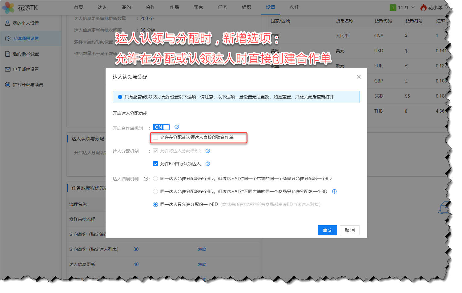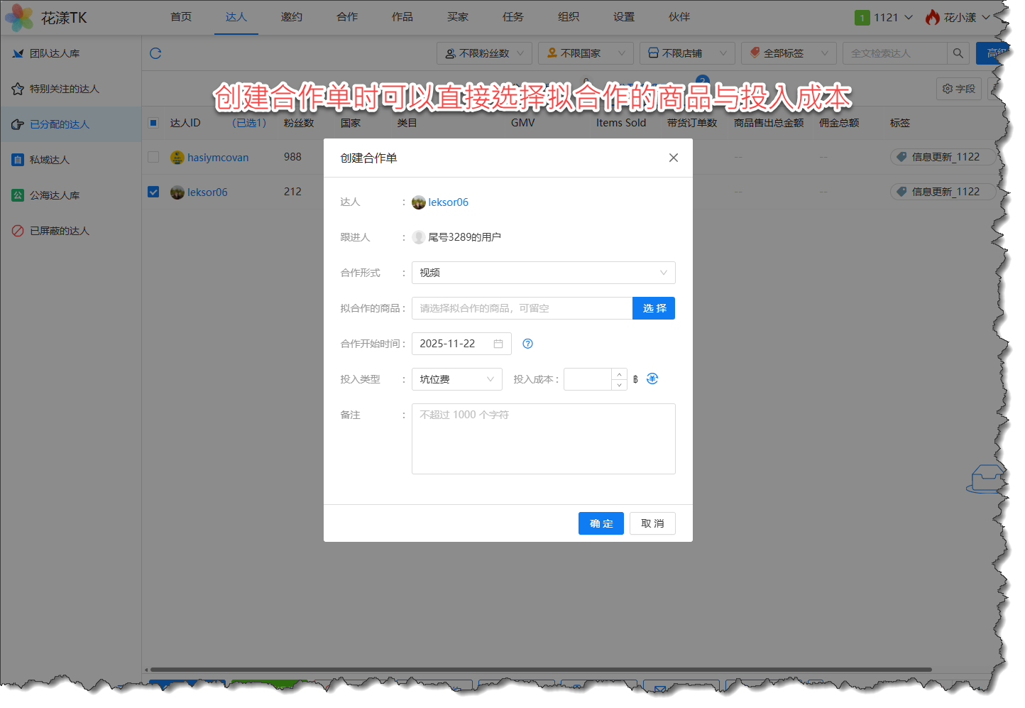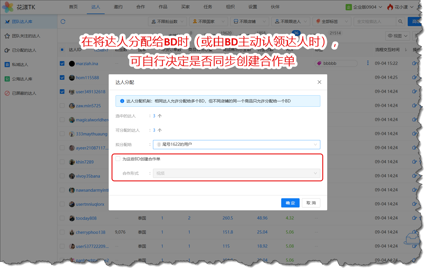 在将达人分配给BD时(或由BD主动认领达人时),用户可自行决定是否同步创建合作单: