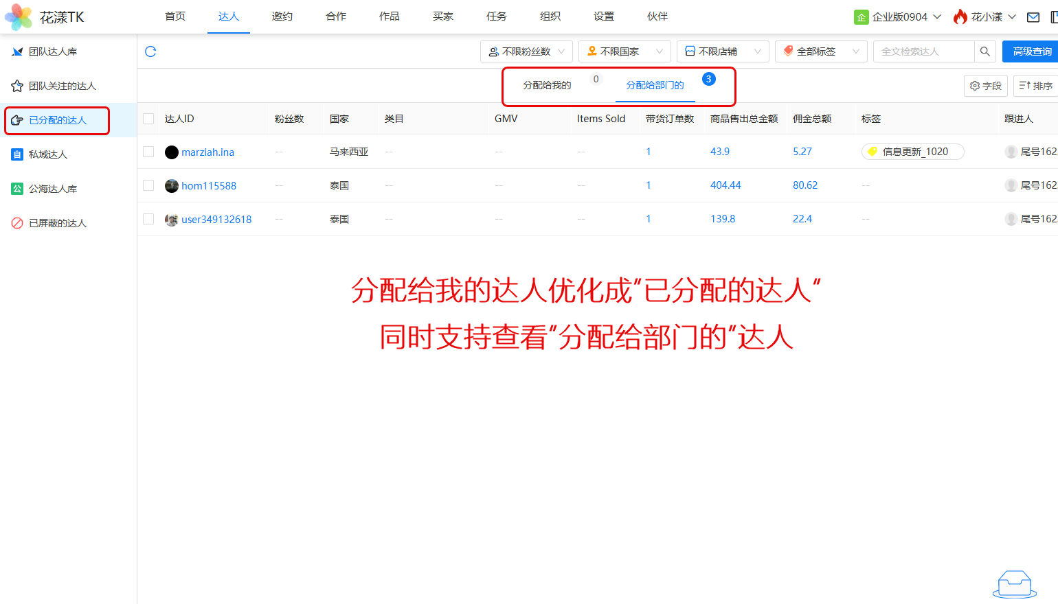 旧有版本中“分配给我的达人”,优化成“已分配的达人”,其中,在“分配的给部门”页签下,您可以查看跟进人为您当前所在部门的所有达人: