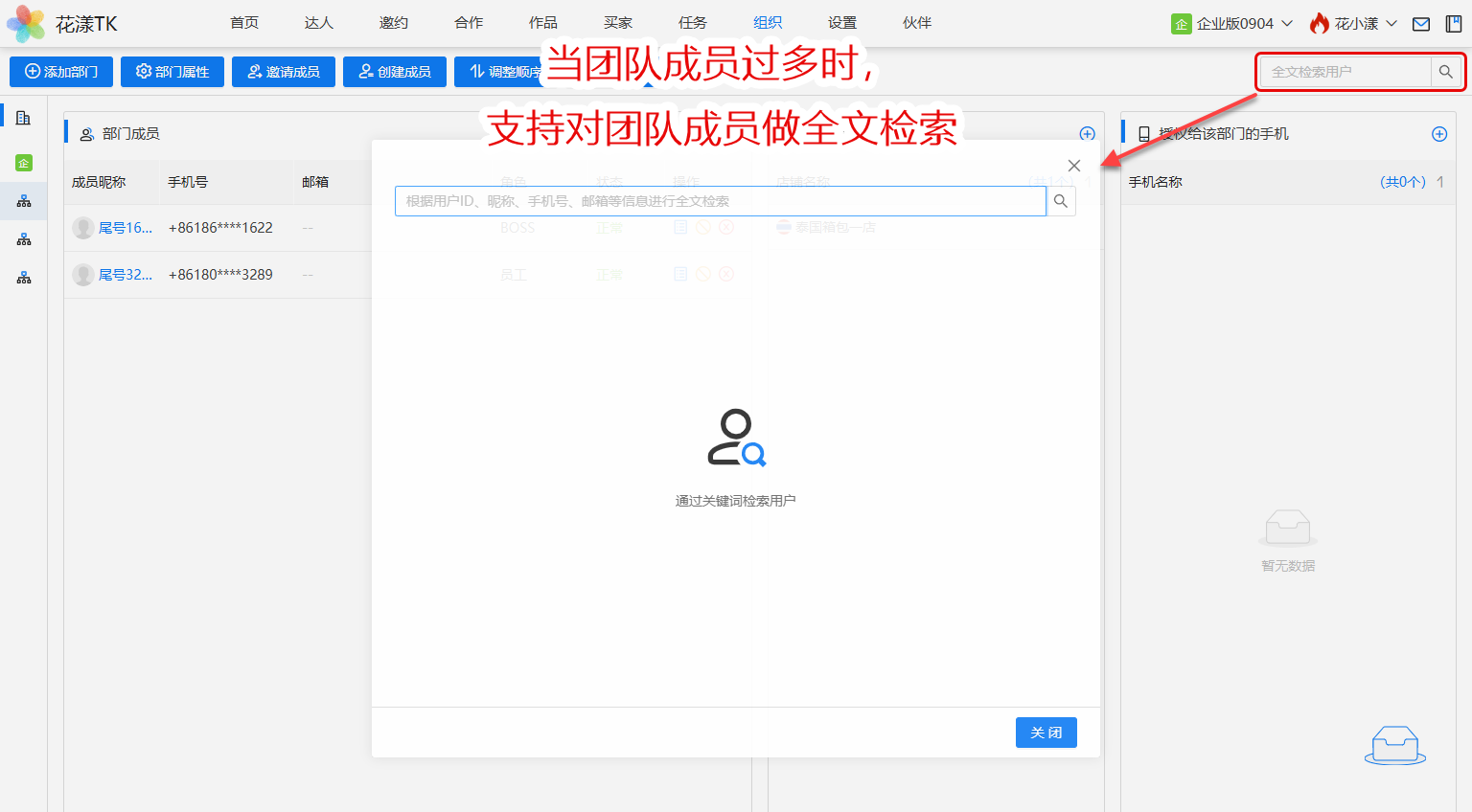1、支持对团队成员进行全文检索