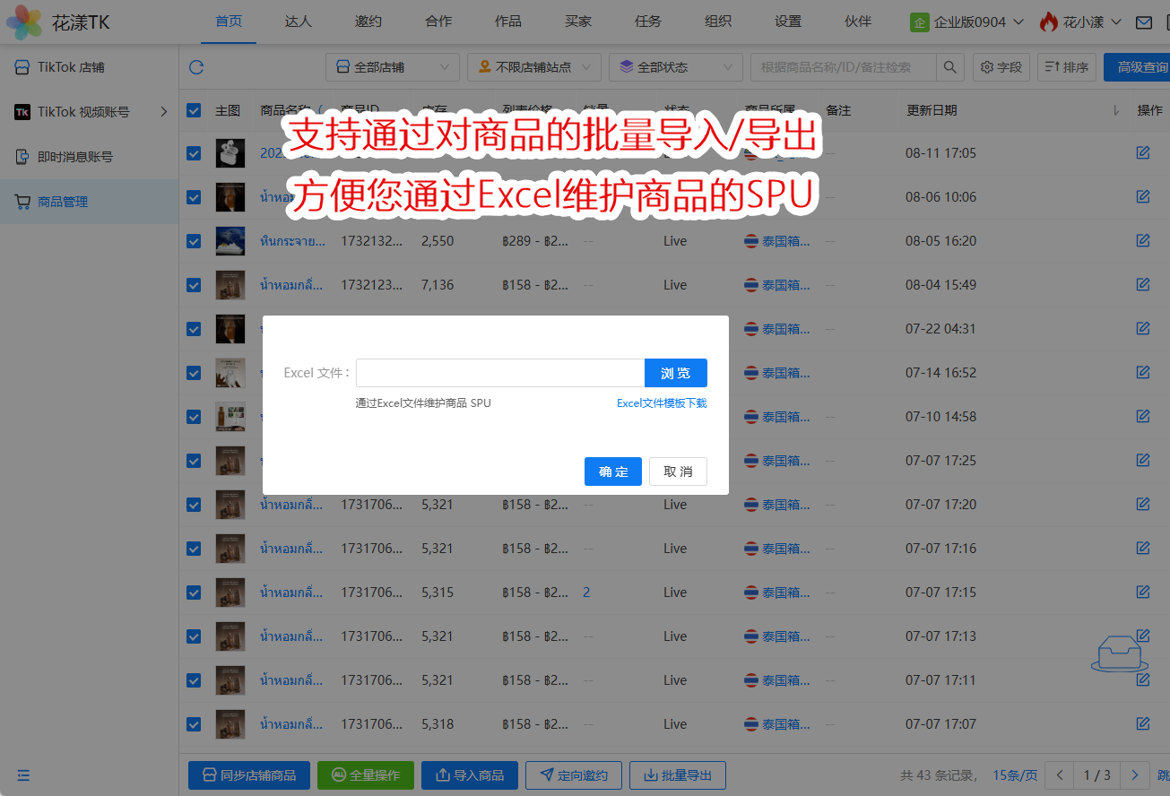 新版本支持对商品进行批量的导入/导出,方便您用 Excel 表格批量维护商品的SPU等信息: