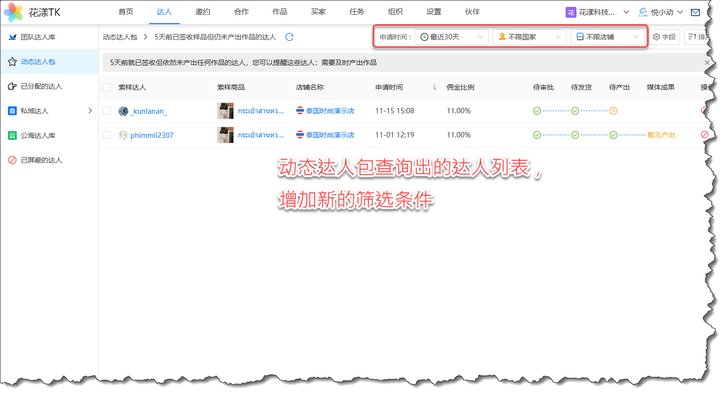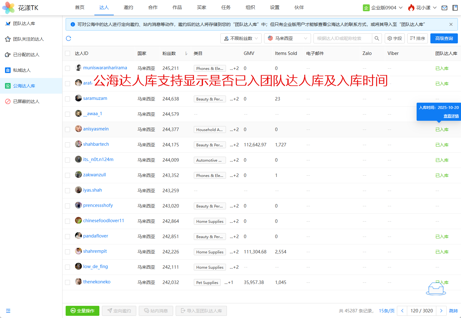新版本的公海达人库支持显示该达人是否已经加入至您的团队达人库,如果已入库,则会显示入库时间: