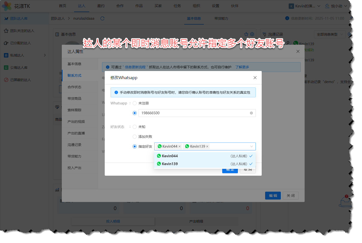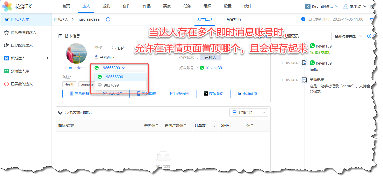 使用场景:有一些卖家朋友针对每个店铺都会准备一个不同的即时消息账号,这就意味着针对同一个达人,在不同的场合中需要使用不同的即时消息账号来与达人沟通,基于此,新版本支持对达人的即时消息账号同时指定多个好友账号: