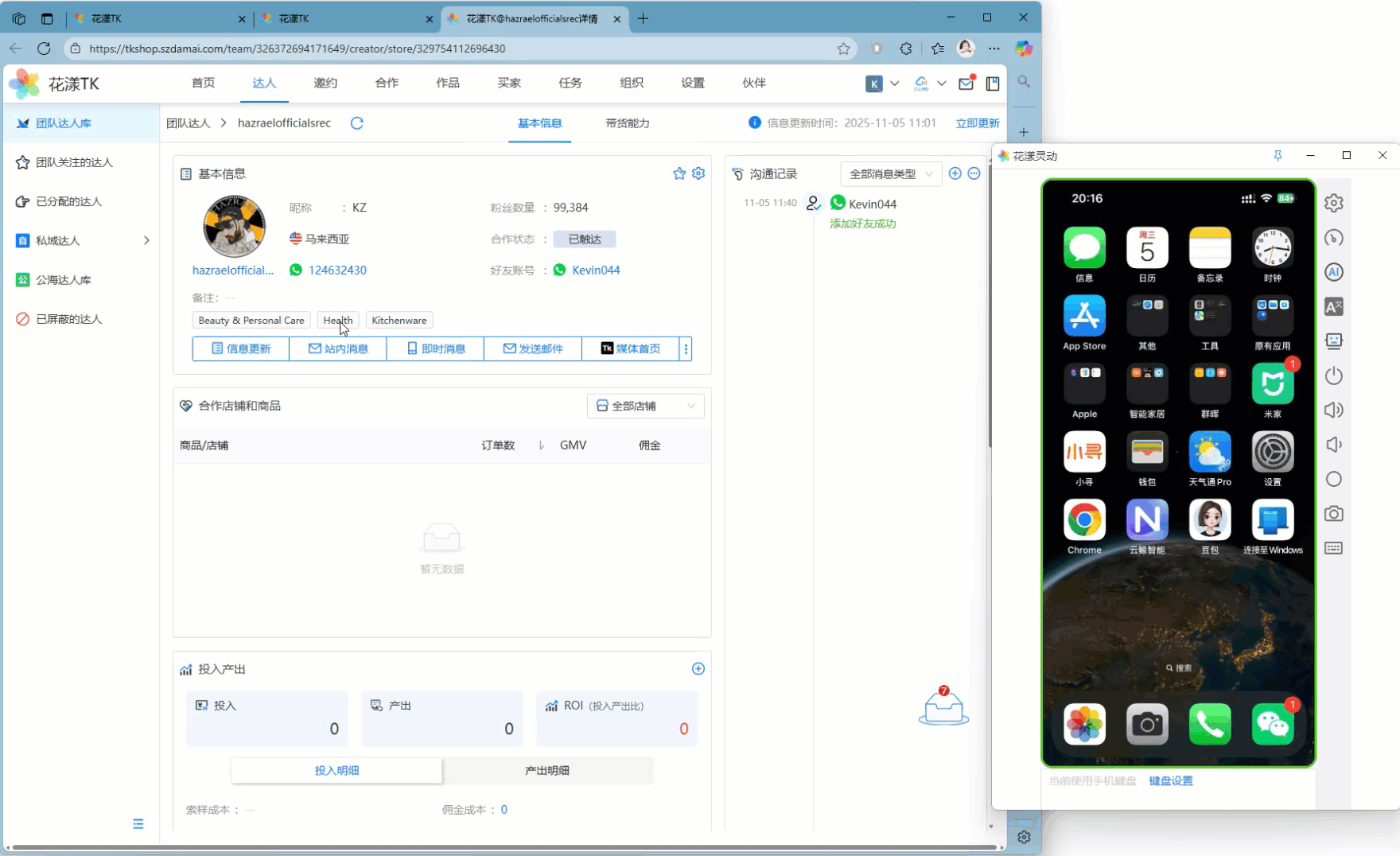 使用场景:当和达人已经互为即时消息好友时,允许一键打开与此达人的聊天窗口。以下图为例,当点击达人即时消息账号的“手动发送消息”时,系统会一键弹出手机,并自动打开与此达人的聊天窗口: