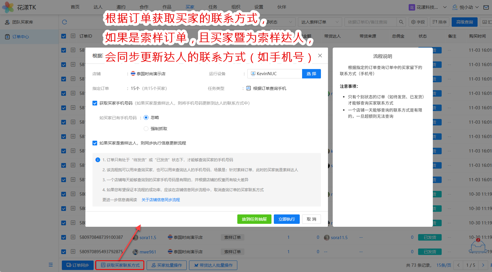 2、根据订单获取买家(暨索样达人)的联系方式