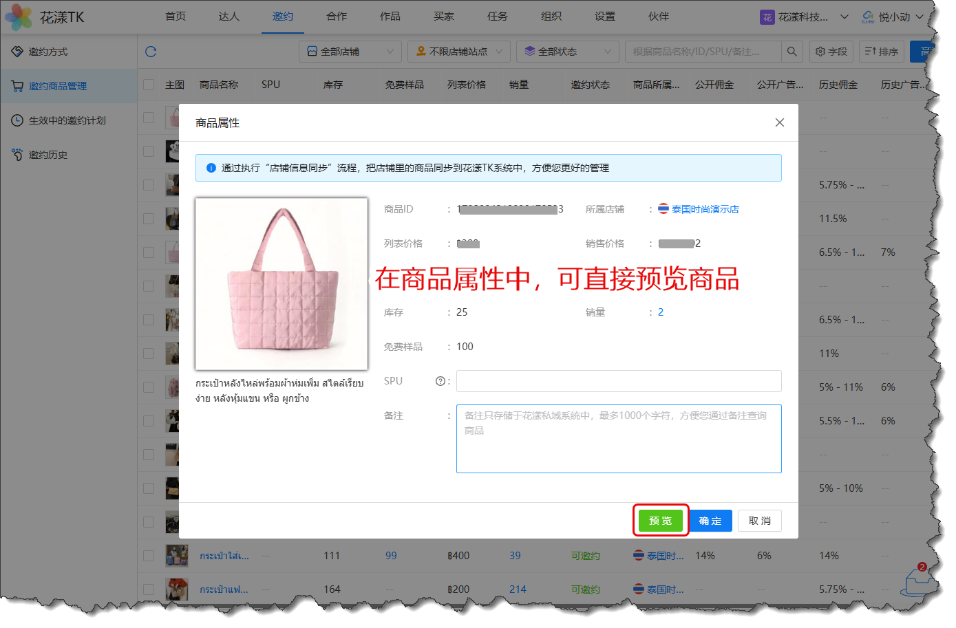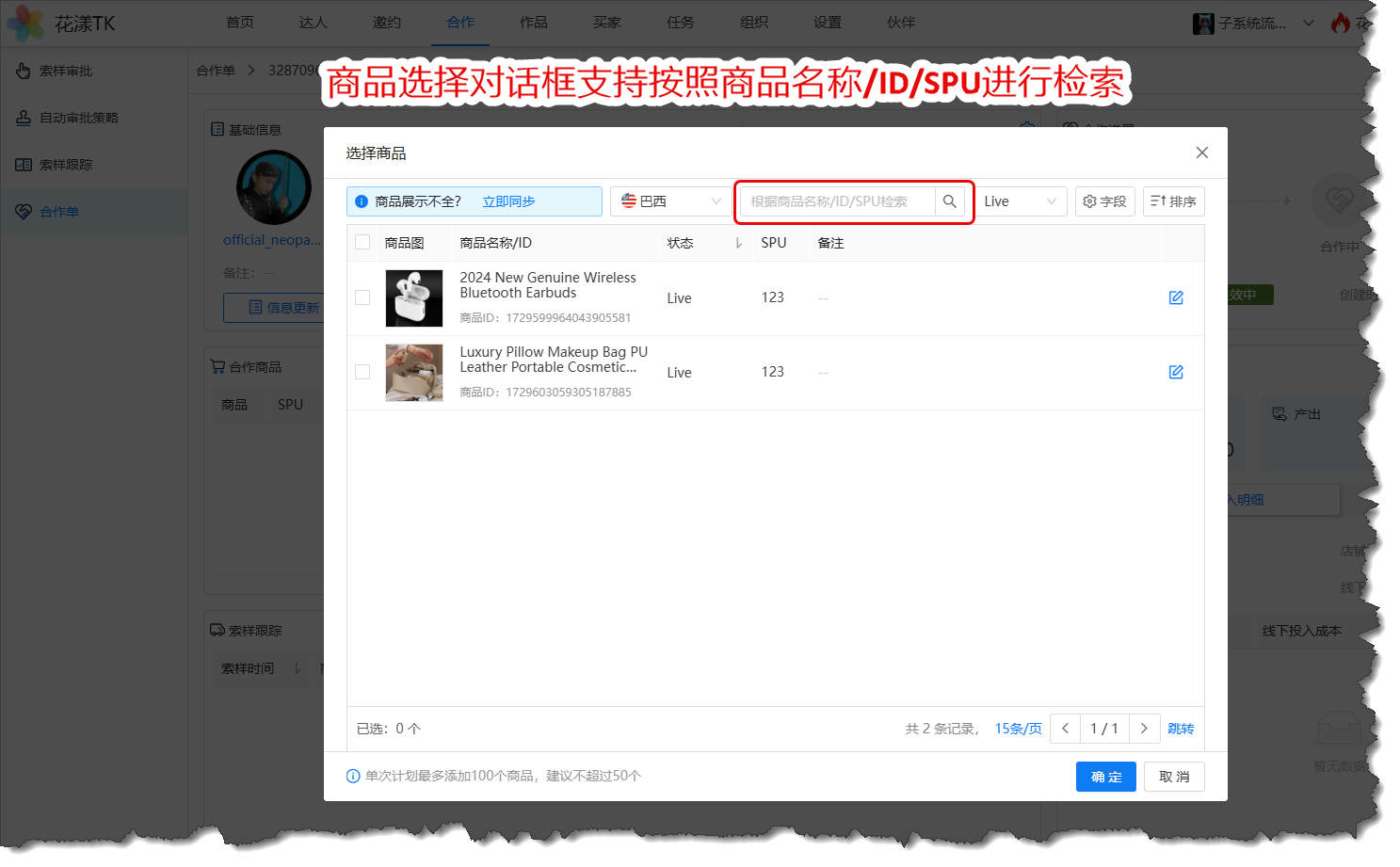 新版本的商品选择对话框,无论是在合作单里选择商品,还是在定向邀约中选择商品,都支持按照商品名称、商品ID、商品SPU进行检索: