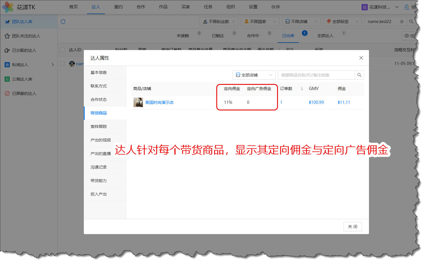 针对达人的带货商品,如果存在某个生效中的定向邀约计划,会显示此达人针对该商品的定向佣金与定向广告佣金,方便您了解达人为您带货时的佣金分成比例: