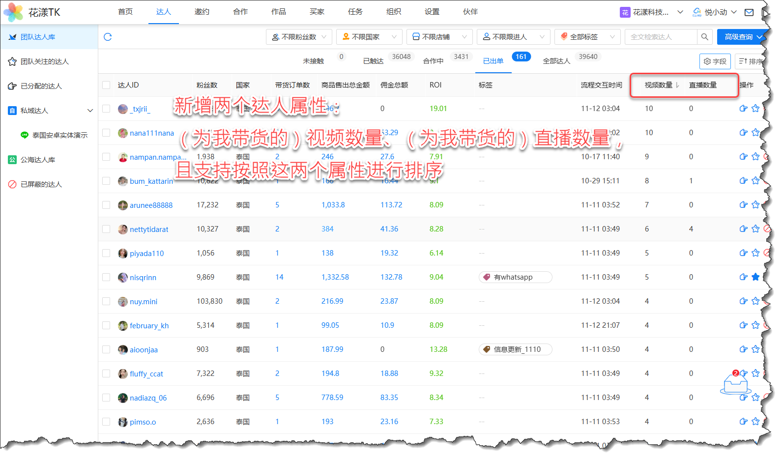 新版本针对达人列表新增了两个属性:为我带货的视频数量(简称视频数量),以及为我带货的直播数量(简称直播数量),并支持按照这两个字段排序,这意味着您很容易的筛选出“为我产出过带货视频”的达人,或者“没有为我产出过带货视频”的达人: